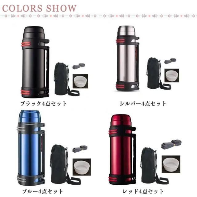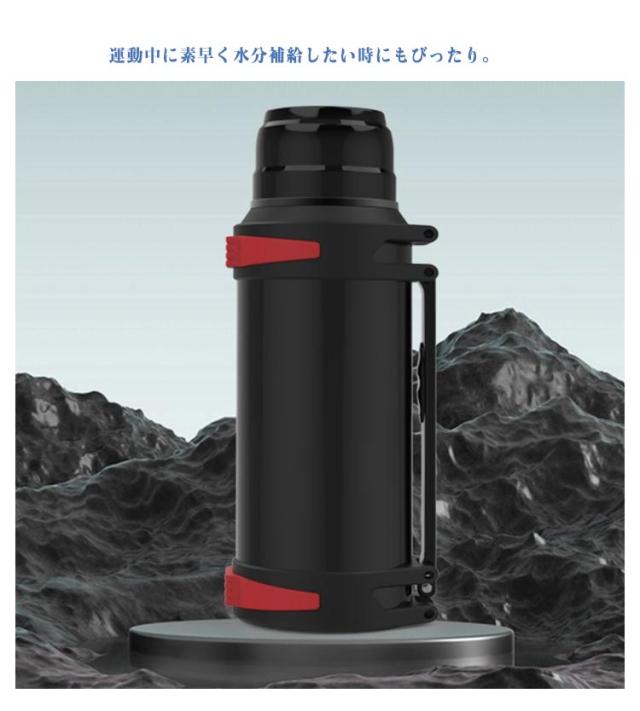 | 1500ml、2000ml、2500ml、3000mlの大容量マグボトル。 保冷力と保温力に優れており、ドリンクの温度を長時間キープできます。 密閉性も高く、傾けたときに漏れにくいのもポイントです。 運動中に素早く水分補給したい時にもびったり。 コップ+肩掛けストライプ+ケース付き、頑丈なつくりなので、キャンプや登山など、アウトドアシーンでの使用にも向いています。 | |