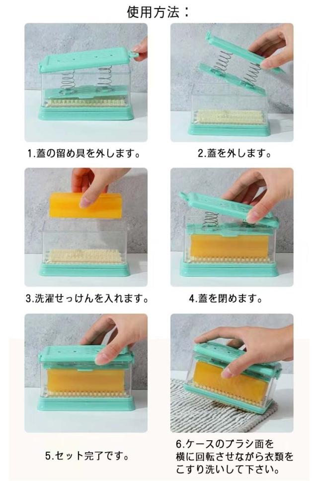 | 洗濯ブラシ石鹸ケース 泡立つ洗濯石鹸ケース。 石鹸ケースとしてもお使い頂けるので、石鹸は入れっぱなしでOK★ 手洗い洗濯したいときに、即使える!洗濯QOLが爆上がりします★ 内蔵のブラシ付きででしっかり泡立つ!ケースに内蔵された回転ブラシをコロコロするだけで、しっかり泡立ちます。 細かい石鹸でも使えるバネ付きケース。ステンレス製の錆びないバネで、石鹸を最後までしっかり使えます。 通気口があり、乾きやすい。蓋には全面の通気口があり、せっけんが乾きやすくなって います。 プレゼントにも最適◎ 使用方法: 1.蓋の留め具を外します。 2.蓋を外します。 3.洗濯せっけんを入れます。 4.蓋を閉めます。 5.セット完了です。 6.ケースのブラシ面を横に回転させながら衣類をこすり洗いして下さい。 | |