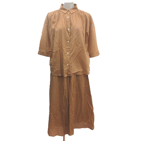 【中古】ルミアン セットアップ 上下 シャツ ブラウス ステンカラー 七分袖 ギャザースカート ロング キャメル 茶