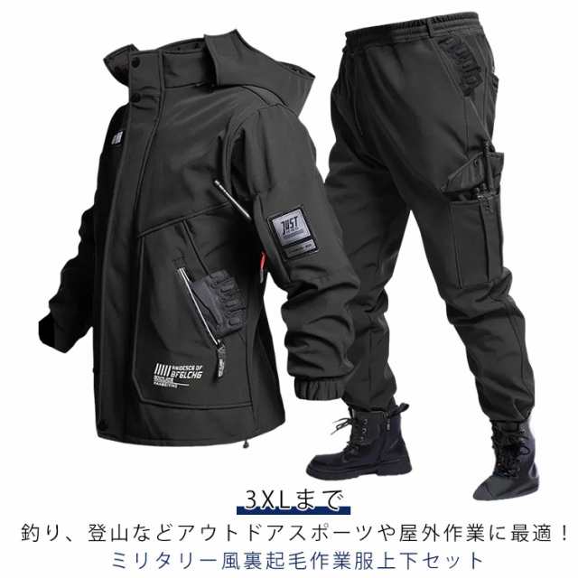 厚手 セットアップ 作業服 ジャケット 上下セット 裏ボア 裏起毛 防水 ウインドブレーカー ズボン 冬 防寒 撥水 軽量 防風 春 秋 防寒 ワークパンツ 作業ズボン メンズ ミリタリー マウンテンパーカー ジョガーパンツ 大きいサイズ 黒 カーキ