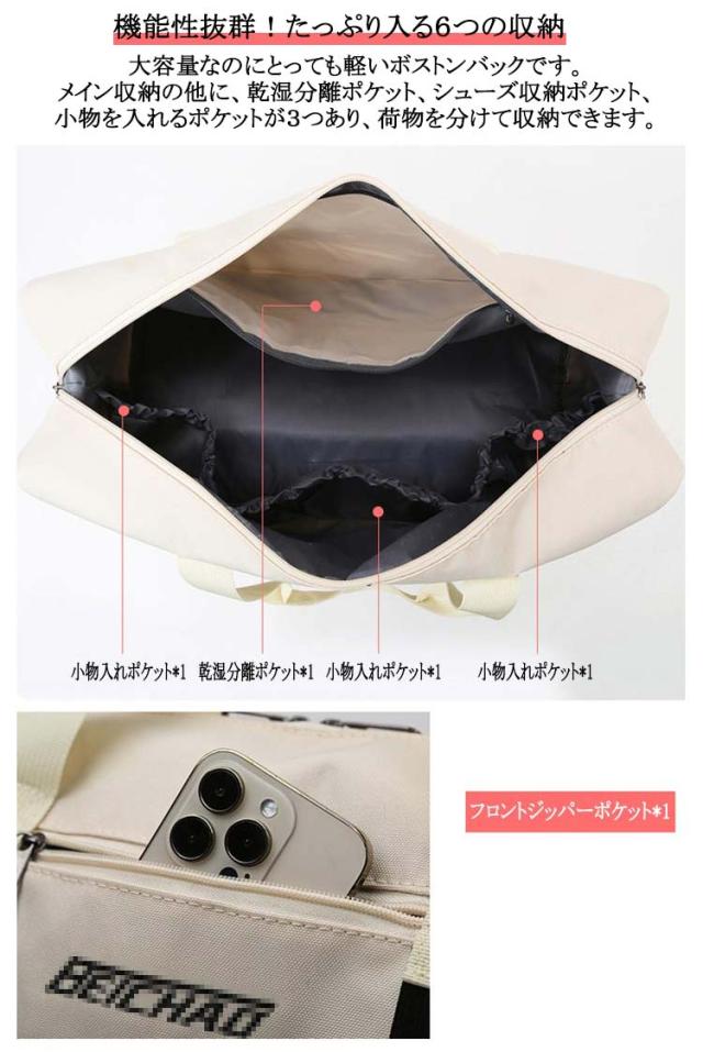 | 【新色追加!全10色!】【多機能?超軽量?防水撥水?乾湿分離】 【機能性抜群!たっぷり入る6つの収納】 大容量なのにとっても軽いボストンバックです。 メイン収納の他に、乾湿分離ポケット、シューズ収納ポケット、小物を入れるポケットが3つあり、荷物を分けて収納できます。 シューズ収納を想定した下部は大きく開口し、出し入れや中身の見やすい便利な形状です。 【持ち運びラクラク、驚きの軽さ】 ボストンバッグ本体の重量はたっだ460g!ショルダーベルトも付属しているので荷物が多くても安心。旅行のサブバッグとしてもおすすめです! 【お手入れ簡単!傷がつきにくく丈夫な素材】 耐久性が高く、撥水効果のあるポリエステル生地を採用しているので急な雨でも安心。 上品な光沢があり、傷もつきにくく、シワもできにくい。汚れた場合は水で手洗いが可能です。 【スタイルに合わせて使える3wayタイプ】 手持ち、肩掛け、キャリーオンバッグとして3wayで使えます。 ゴルフバッグ、ジムバッグ、ヨガバッグ、プールバッグ、スポーツバッグ、旅行バッグ、トラベルバッグ、非常用バッグ、お買い物バッググに。 小学生の修学旅行のバッグや出張用としてもおすすめです。 【スタイリッシュで洗練されたデザイン】 男女問わず、子供から大人まで家族みんなで使えるシンプルなデザインです。 スポーツ、アウトドア、旅行などの用途から普段使いまで、あらゆる場面でご使用いただけます。 | |