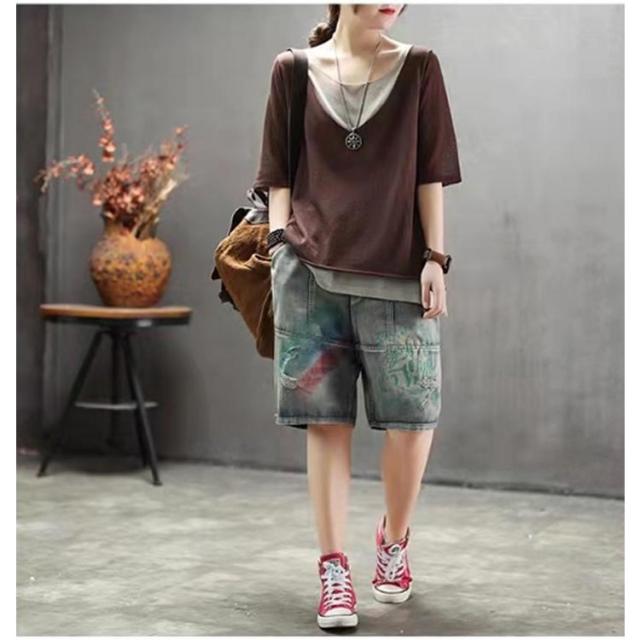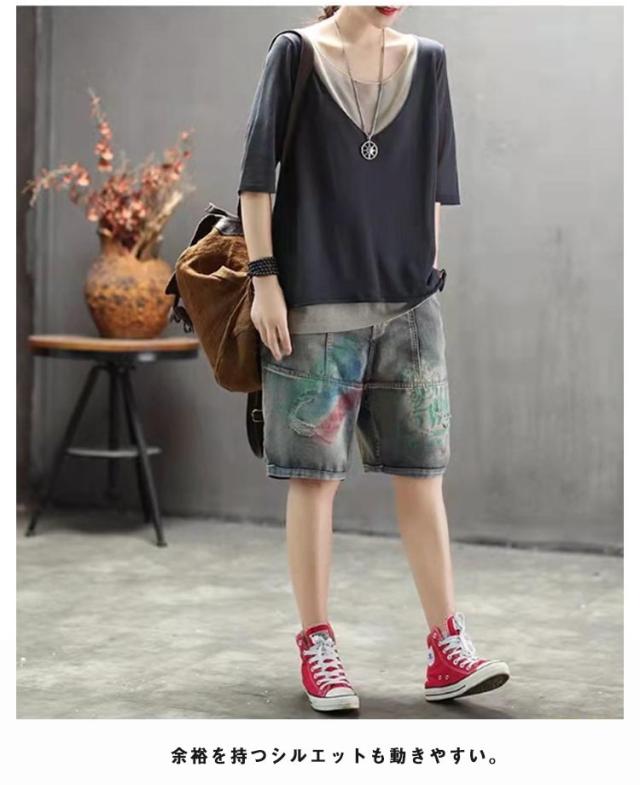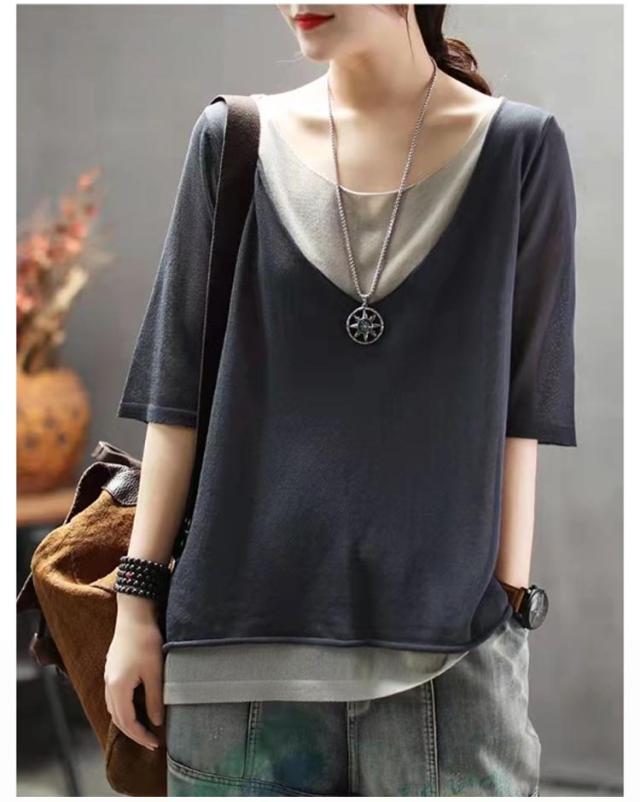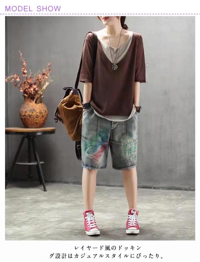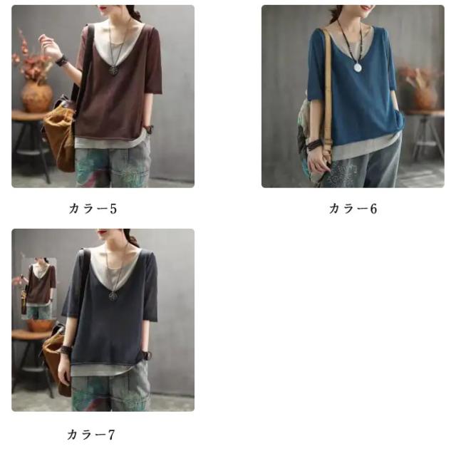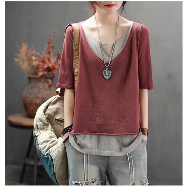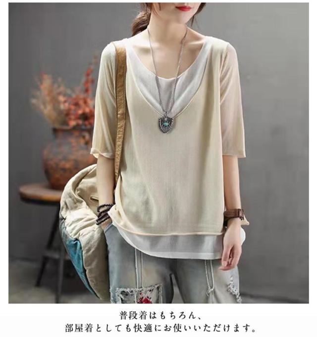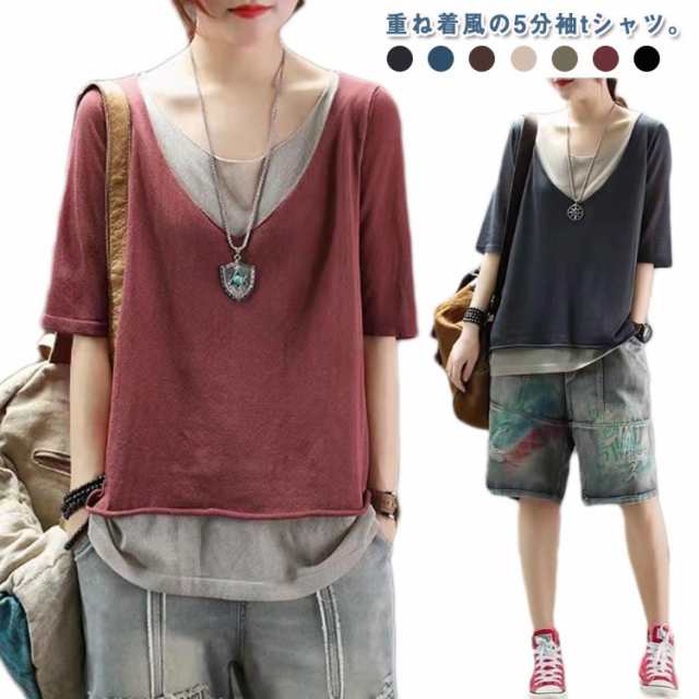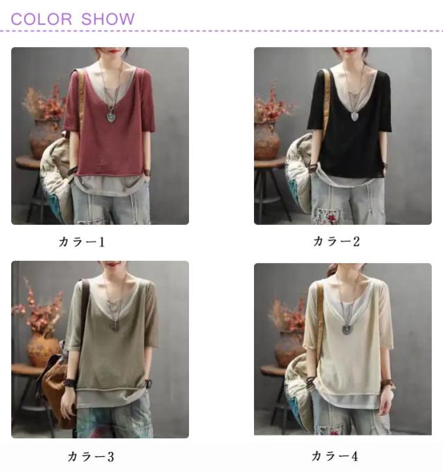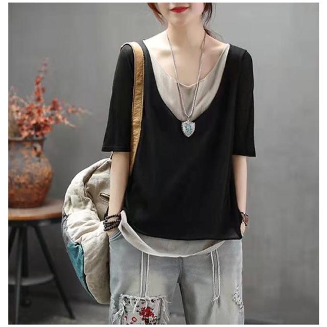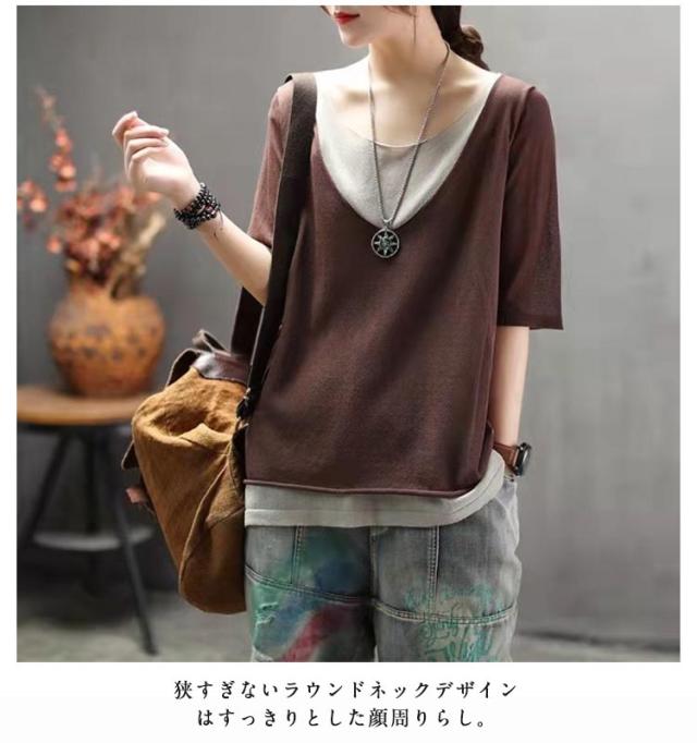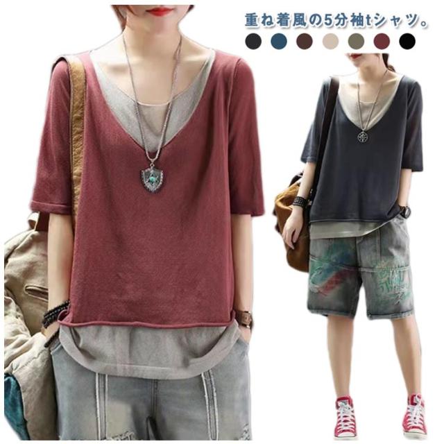 Tシャツ レディース 半袖 ゆったり 切り替えTシャツ 半袖Tシャツ 切り替え フェイクレイヤード 重ね着風 シンプル 大人 可愛い カットソー トップス 体型カバー レトロ カジュアル S M L XL 2XL 3XL