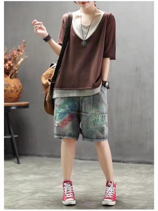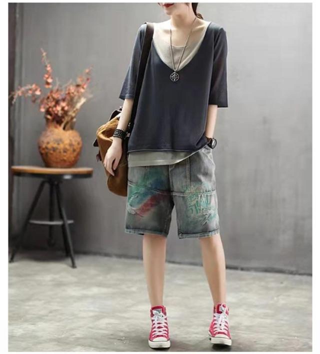 | 重ね着風の5分袖tシャツ。 狭すぎないラウンドネックデザインはすっきりとした顔周りらし。 レイヤード風のドッキング設計はカジュアルスタイルにぴったり。 余裕を持つシルエットも動きやすい。 普段着はもちろん、部屋着としても快適にお使いいただけます。 | |