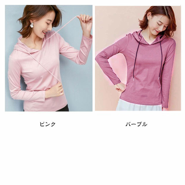 | 【7color】フード付き長袖Tシャツ。 生地は伸縮性があり、柔らかい肌触りで着心地快適。 体型をさりげなくカバーするゆるシルエットが嬉しいポイント。 春秋は1枚で、ボトムスを選ばず、スタイルよくお洒落ガールに♪ ちょっと肌寒い時はニットベストとコーデすれば、旬のスタイルGET! | |