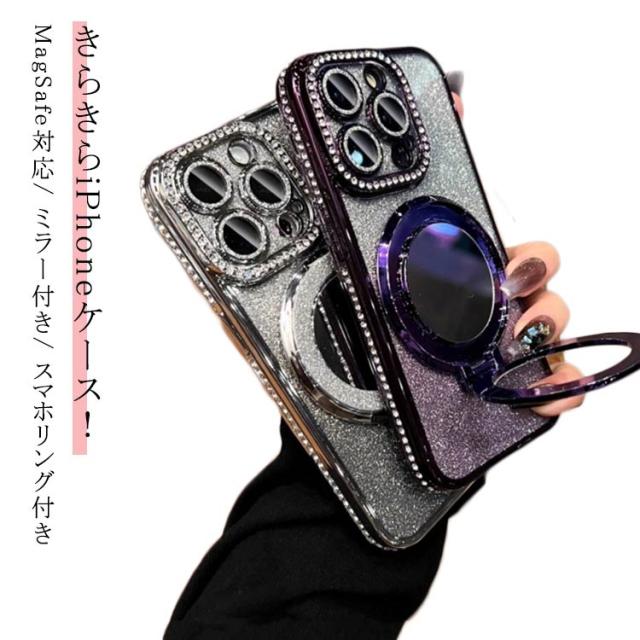 | きらきらiPhoneケース! MagSafe対応/ ミラー付き/ スマホリング付き スマホスタンドには強力マグネット内蔵でMagSafe充電が可能。 リングを立てればスタンドに 横置き・縦置きOK 弾力のあるTPUで、端末をしっかり保護 | |