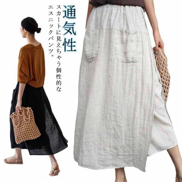 スカート付きパンツ 綿麻 キュロット ワイドパンツ スカート風 ガウチョパンツ クロップド丈 重ね着風 カジュアルパンツ ゆったり 体型カバー 薄手 通気性 春 夏 秋 母の日 ブラック ホワイト