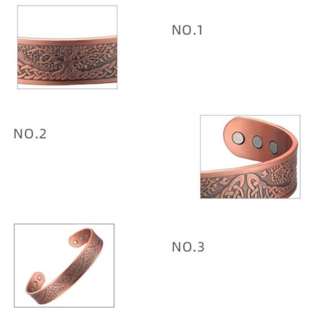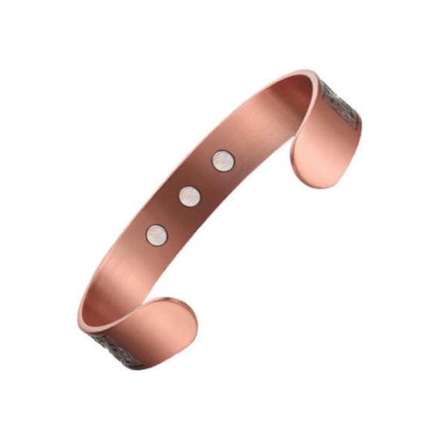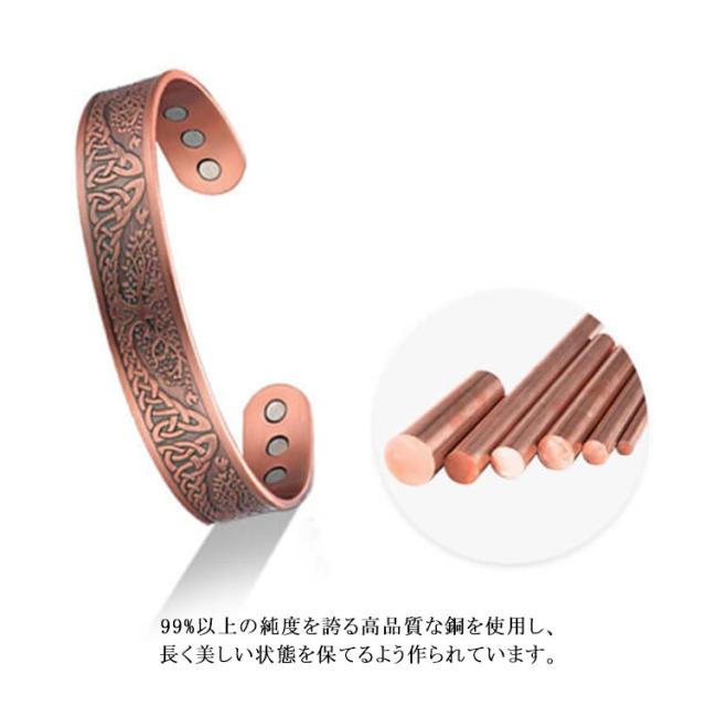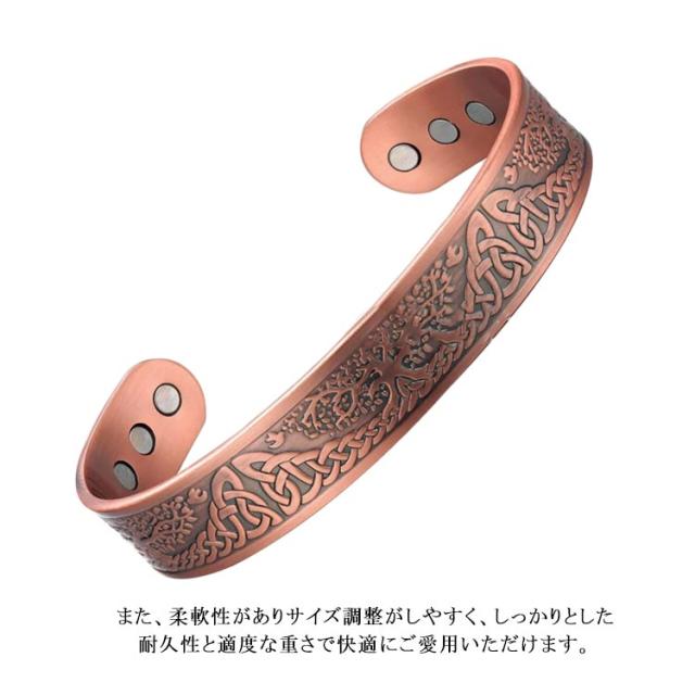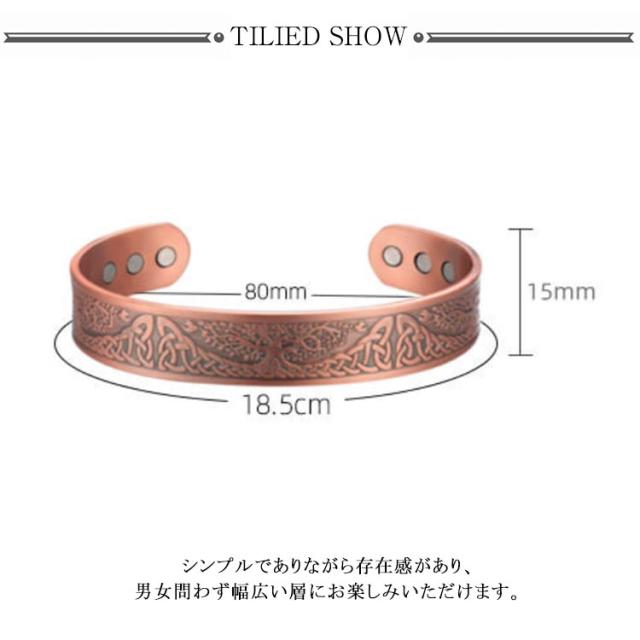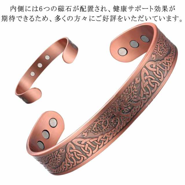 | 内側には6つの磁石が配置され、健康サポート効果が期待できるため、多くの方々にご好評をいただいています。 シンプルでありながら存在感があり、男女問わず幅広い層にお楽しみいただけます。 また、柔軟性がありサイズ調整がしやすく、しっかりとした耐久性と適度な重さで快適にご愛用いただけます。 99%以上の純度を誇る高品質な銅を使用し、長く美しい状態を保てるよう作られています。 | |