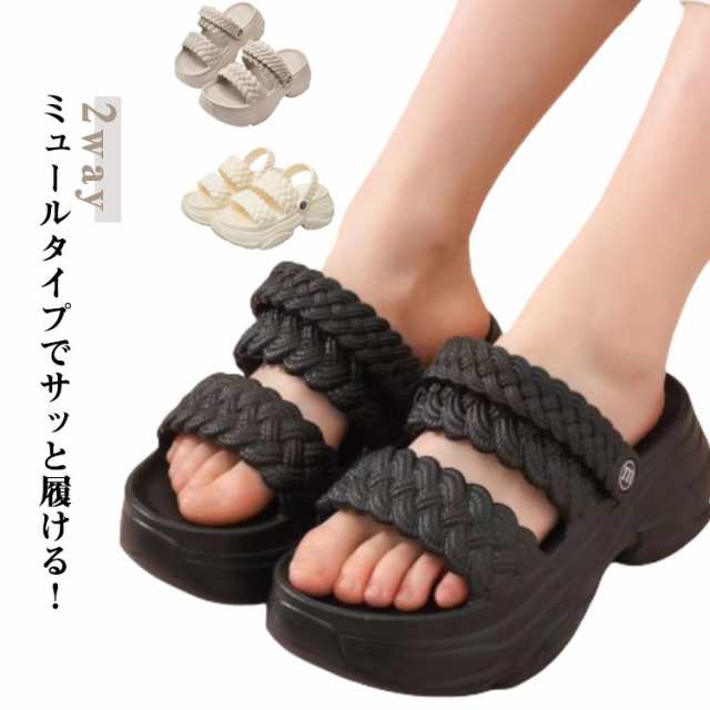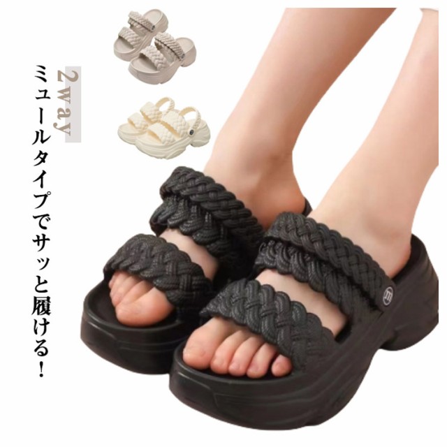 | ミュールタイプでサッと履ける! ベルトをかかとに掛けても外しても履ける便利な2Way 厚みがあるので底付き感がなく、疲れにくいのもうれしいところ。 ちょっとそこまでのお出かけから社内の室内履きやベランダ用スリッパなどにも◎ 水に濡れてもOKのEVA素材で、プールやビーチサイドでの着用も◎ | |