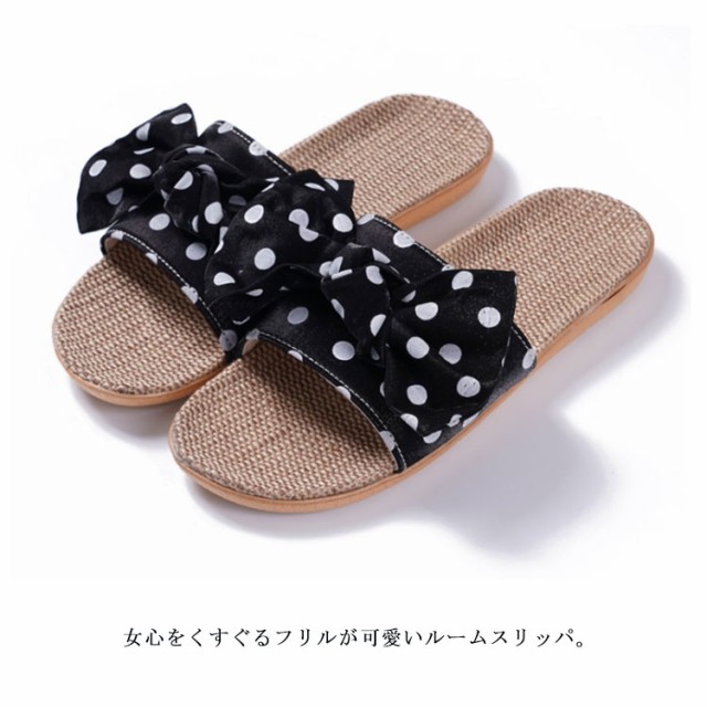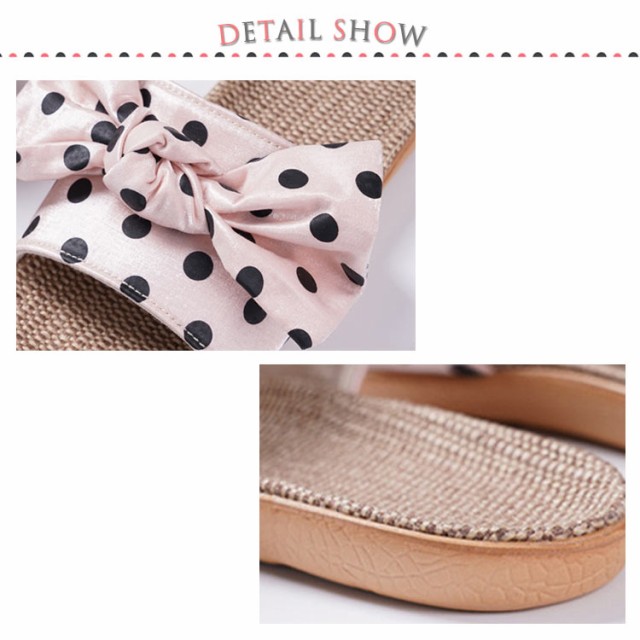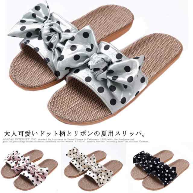 夏スリッパ リネン ルームシューズ ドット柄 リボン レディース 送料無料 抗菌防臭 ビーチサンダル 室内履き レジャー用 来客用 オフィス用 麻サンダル