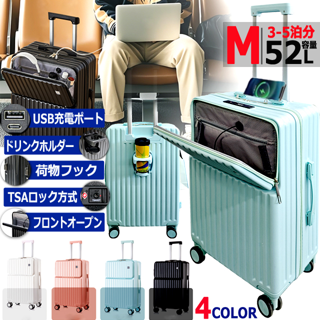 USBポート付きフロントオープンキャリーケースM 52L TSAロック ドリンクホルダー 荷物フック モバイルバッテリー 空港 旅行 スーツケース