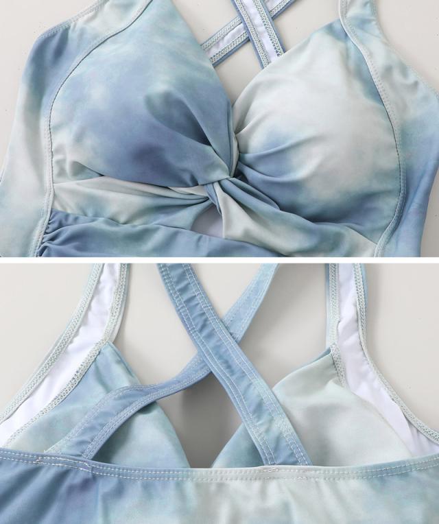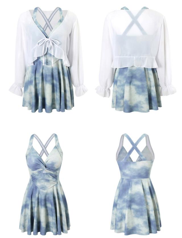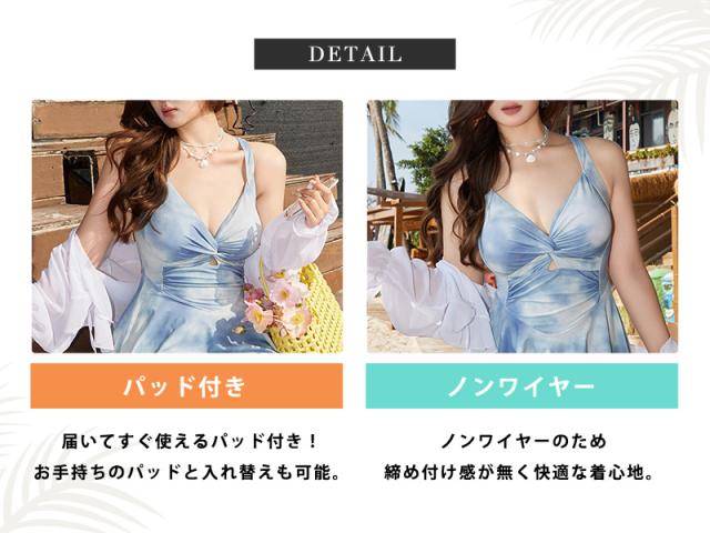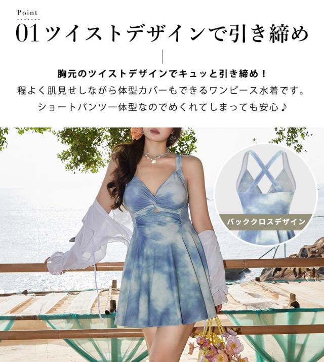夏新作水着 ワンピース 体型カバー シアー トップス 2点セット 大きいサイズ レディース オールインワン タイダイ柄 胸元 ツイスト バッククロス ぽっちゃり ショート丈 ボレロ 長袖 フレア ノンワイヤー 二の腕 ウエスト ヒップ 太もも カバーアップ