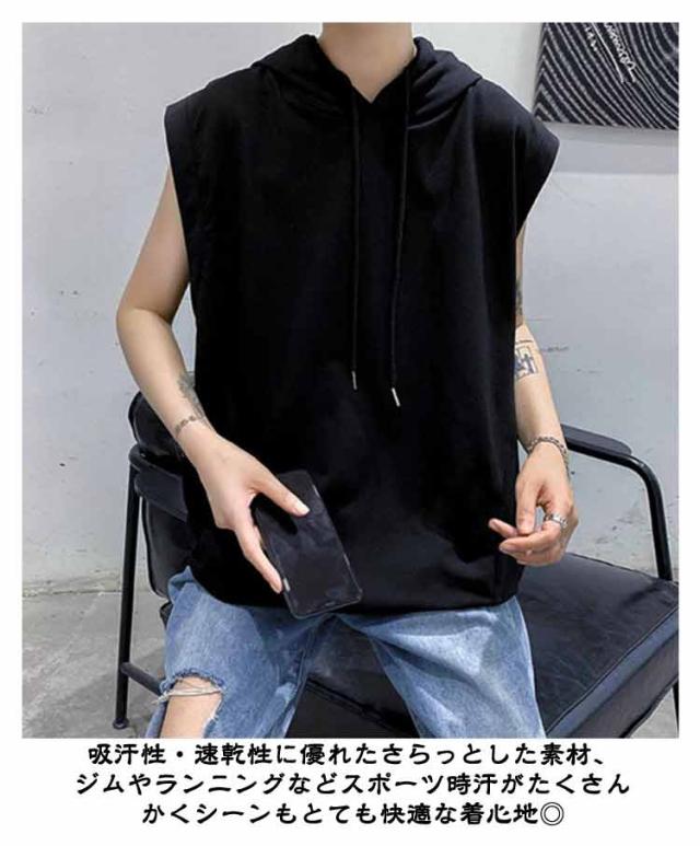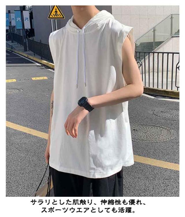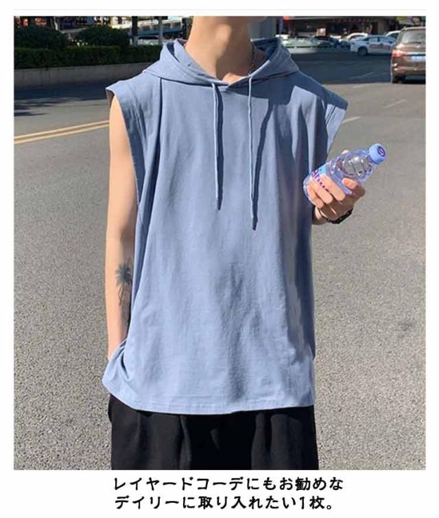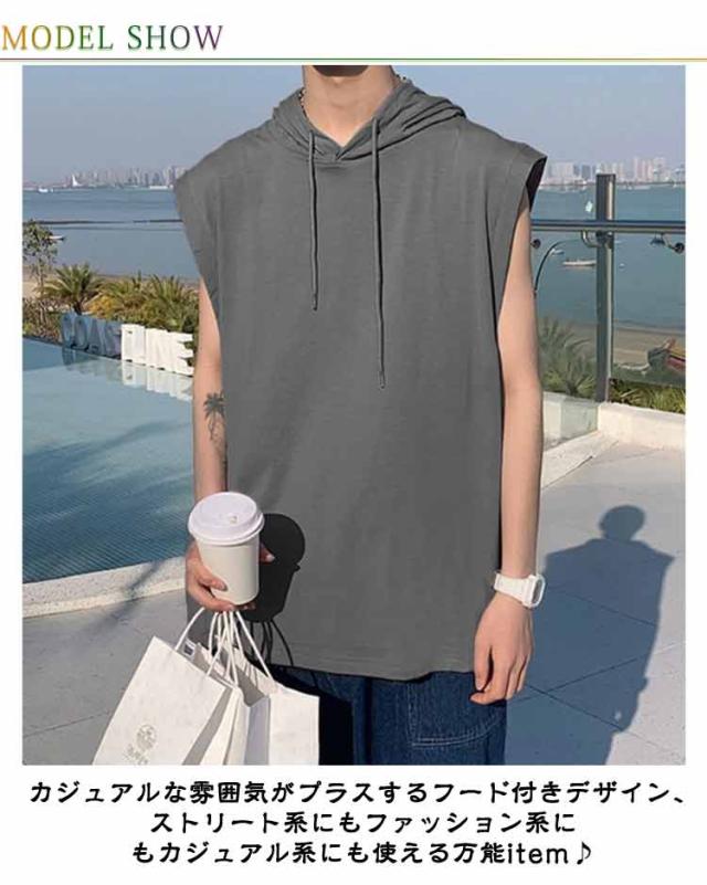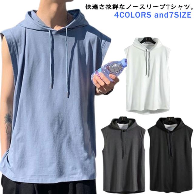 ノースリーブ 袖なし tシャツ メンズ タンクトップ ノースリーブ 夏Tシャツ 男性 無地 ノースリーブtシャツ ゆったり フード付きタンクトップ プルオーバー フード付き 夏 薄手 パーカー お洒落 ヒップホップ ストリート風