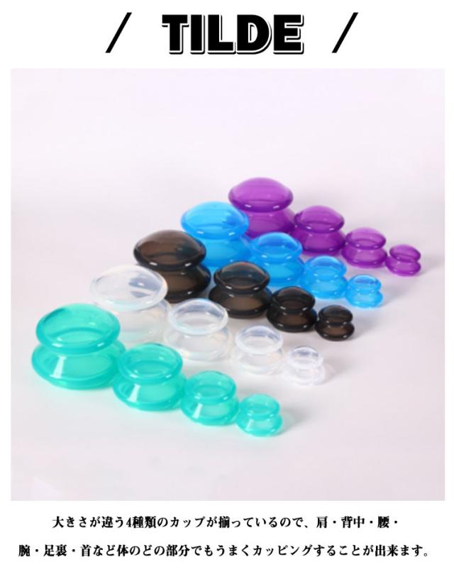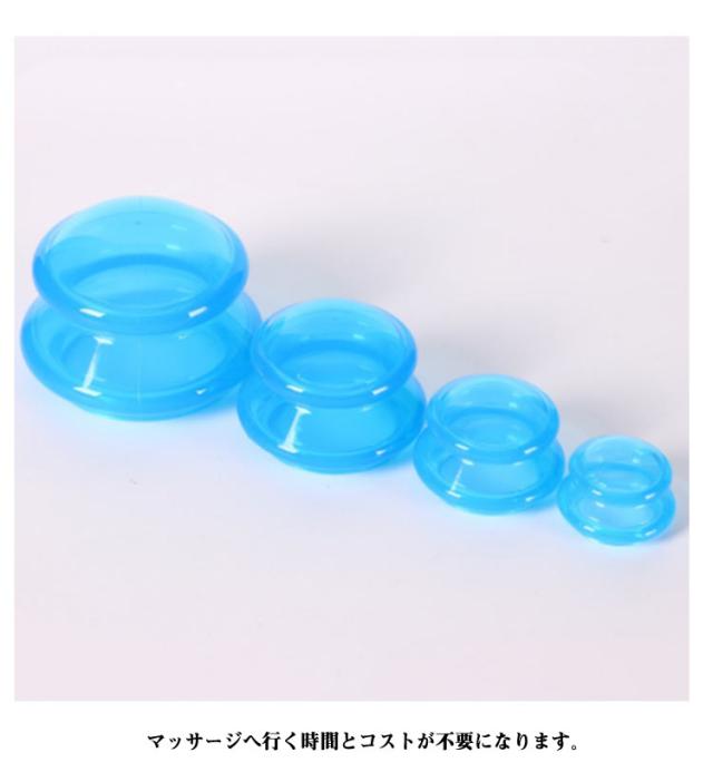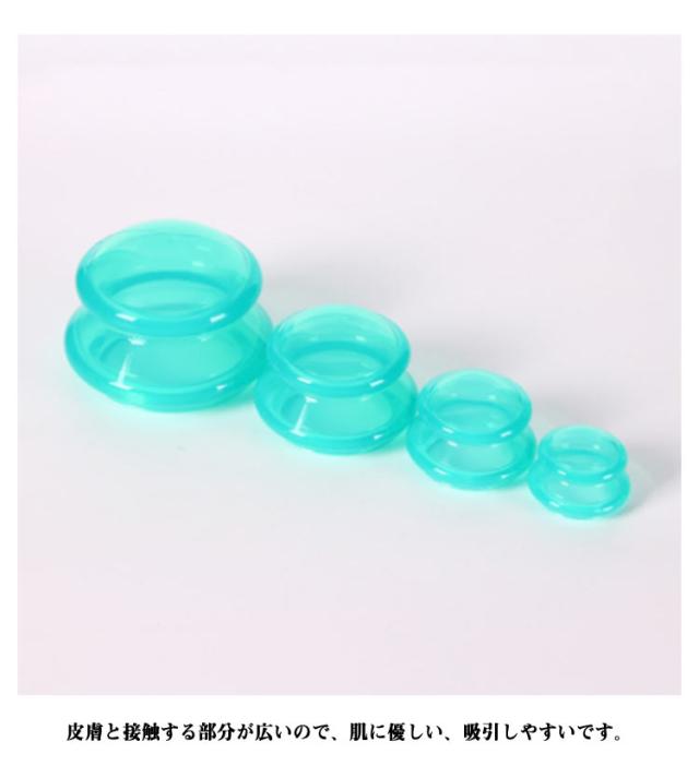 | 【4点セット】【シリコン製】 お家で手軽にできるセルフカッピングキット シリコーン製で簡単に装着できます 大きさが違う4種類のカップが揃っているので、肩・背中・腰・腕・足裏・首など体のどの部分でもうまくカッピングすることが出来ます。 皮膚と接触する部分が広いので、肌に優しい、吸引しやすいです。 使って数分で、コリの解消と体が楽になることが実感できますと思います。 マッサージへ行く時間とコストが不要になります。 | |
