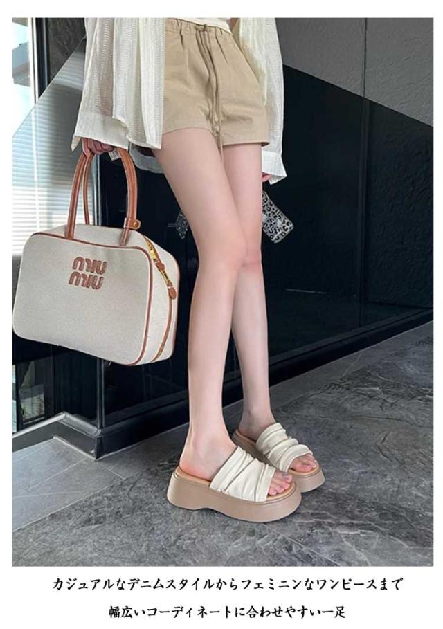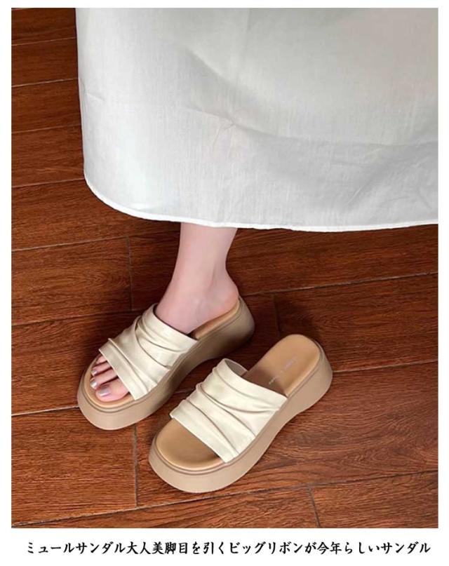 | ミュールサンダル大人美脚目を引くビッグリボンが今年らしいサンダル 涼しげな厚底デザインが大人リラックス感を醸し出すサボサンダル。 ボリューム感のあるプラットフォームソールで安定感があり、厚底でも疲れにくく、足を華奢に見せてくれる。 シンプルなのでコーディネートしやすく、一気にトレンド感が出せるおすすめアイテムです。 カジュアルなデニムスタイルからフェミニンなワンピースまで幅広いコーディネートに合わせやすい一足 | |
