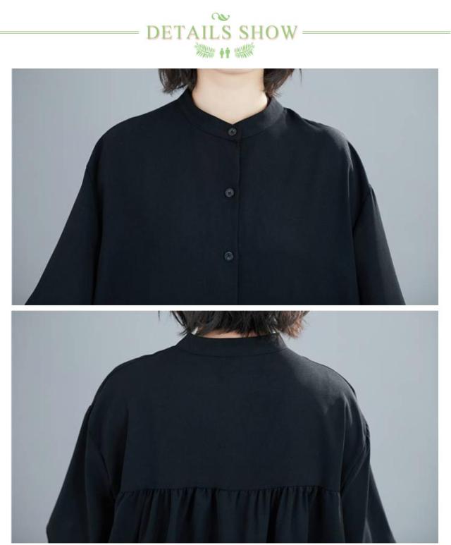 バンドカラーシャツ シャツ ギャザー 半袖シャツ スタンドカラー 五分袖 きれいめ 黒シャツ 半袖 スタンドカラーシャツ バンドカラーシャツ ブラウス ボリューム 夏ブラウス 半袖ブラウス ゆるシャツ 前後差