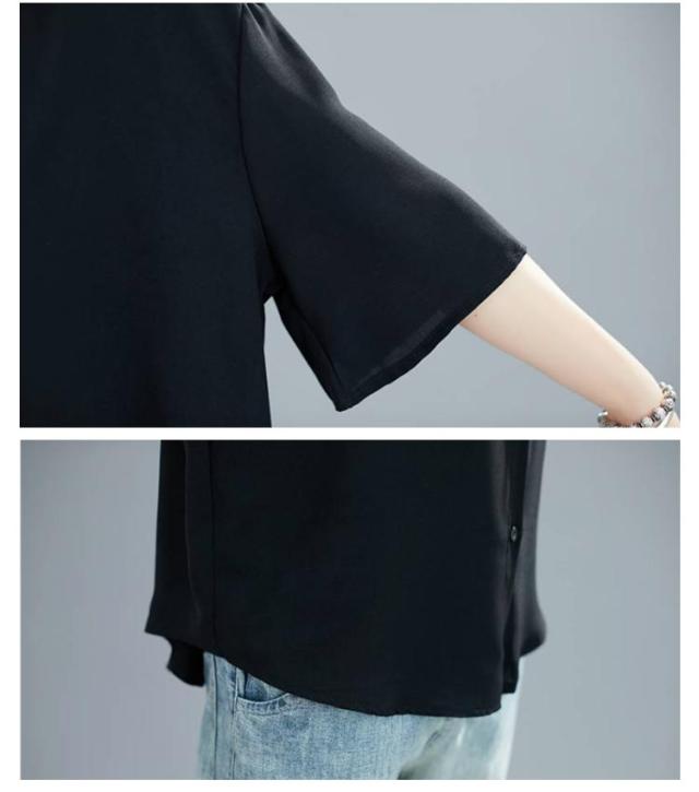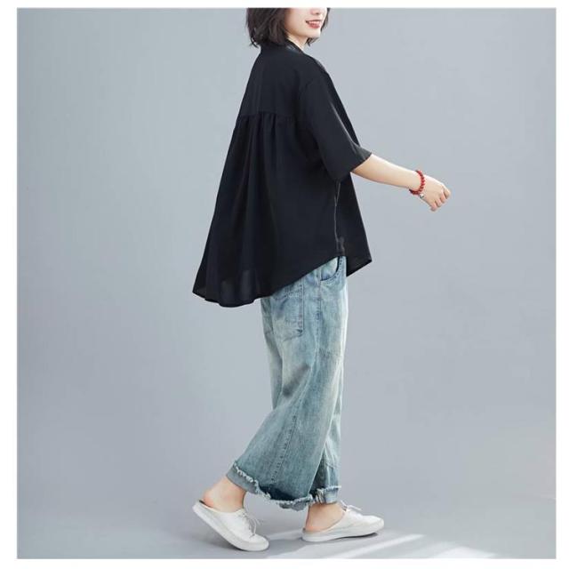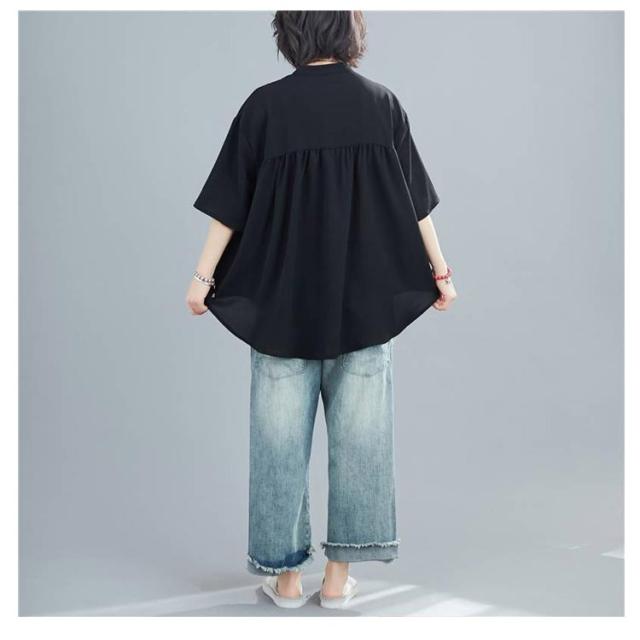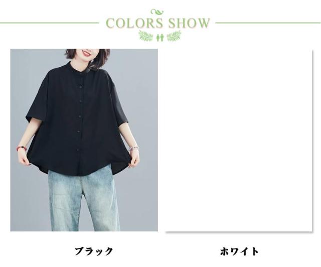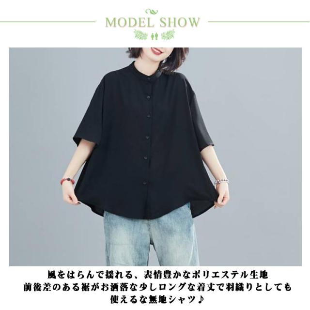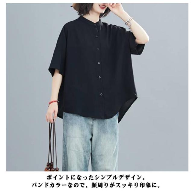 バンドカラーシャツ スタンドカラー 半袖シャツ バンドカラーシャツ ブラウス シャツ 黒シャツ 五分袖 ボリューム スタンドカラーシャツ 半袖 ギャザー 夏ブラウス レディース 半袖ブラウス ゆるシャツ 前後差