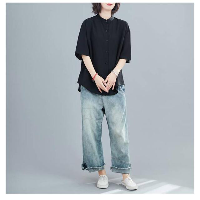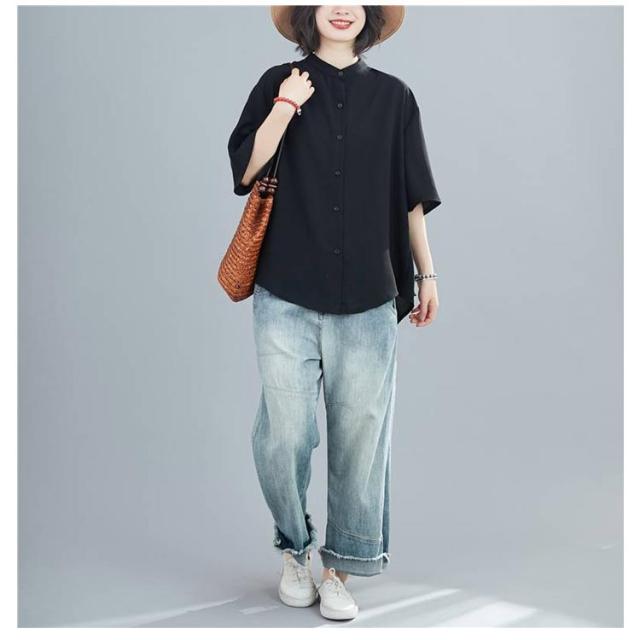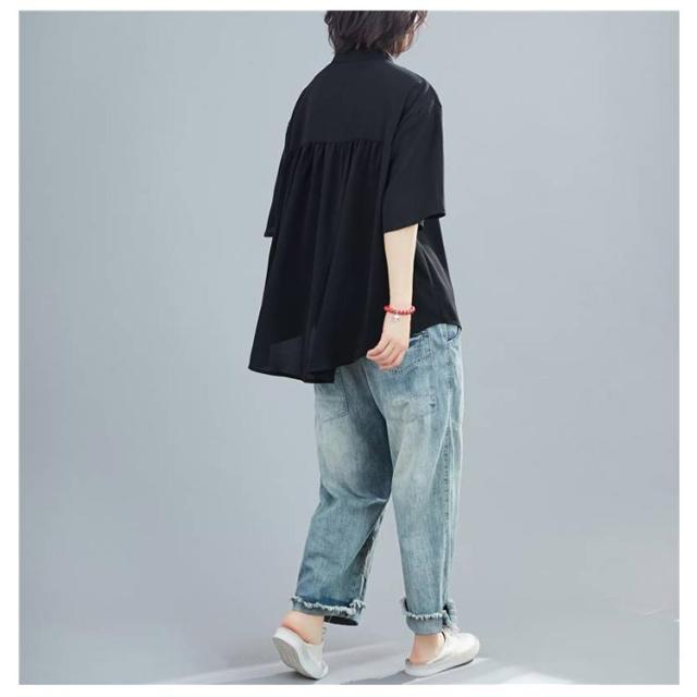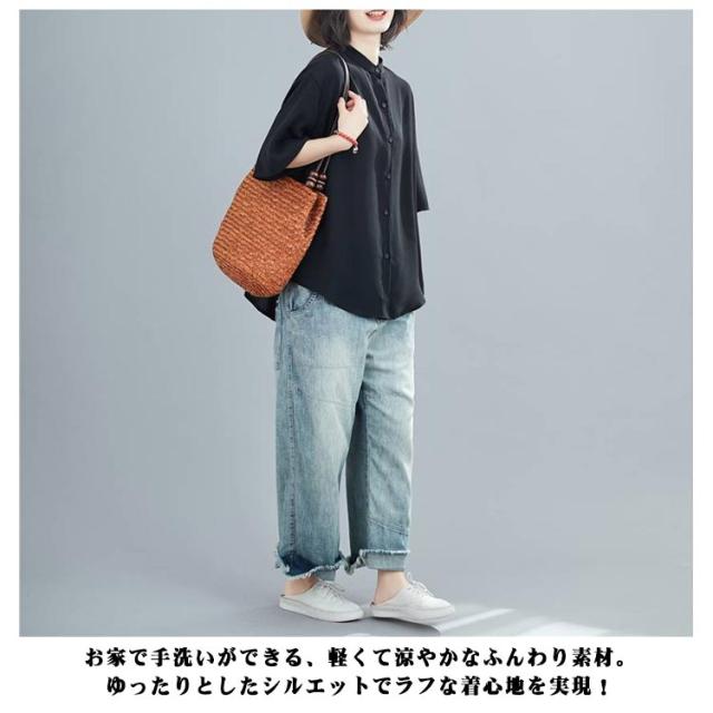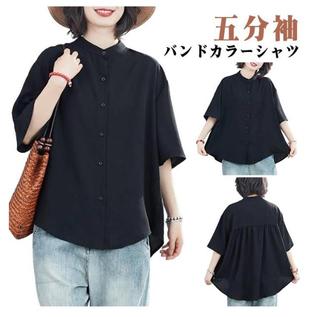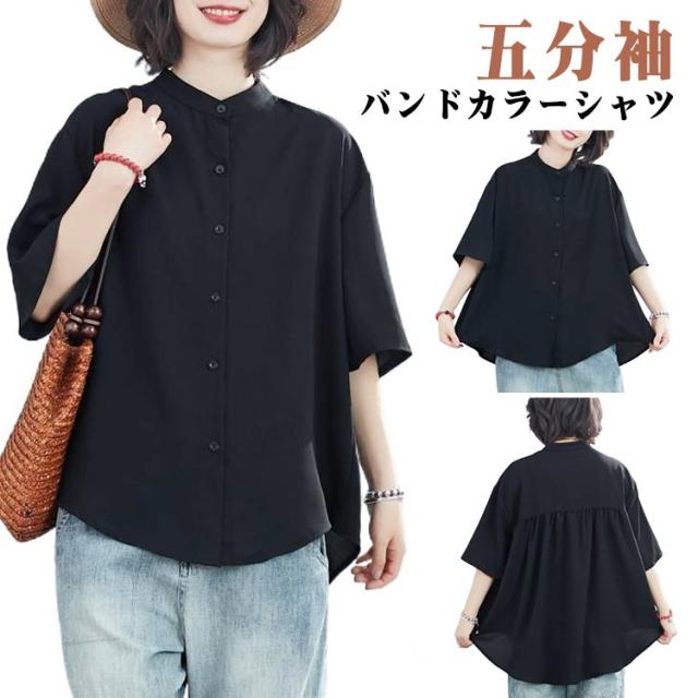 五分袖 半袖シャツ バンドカラーシャツ スタンドカラー シャツ レディース 半袖 黒シャツ ボリューム スタンドカラーシャツ バンドカラーシャツ ギャザー きれいめ 夏ブラウス 半袖ブラウス ゆるシャツ 前後差