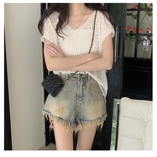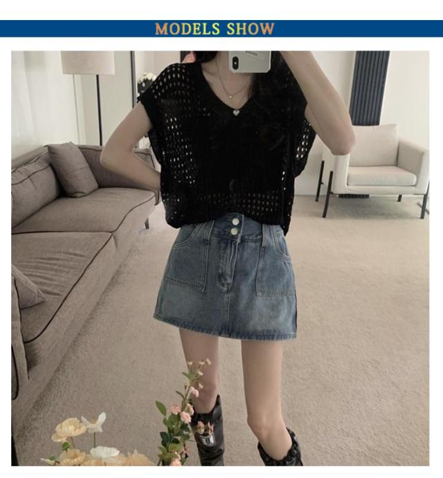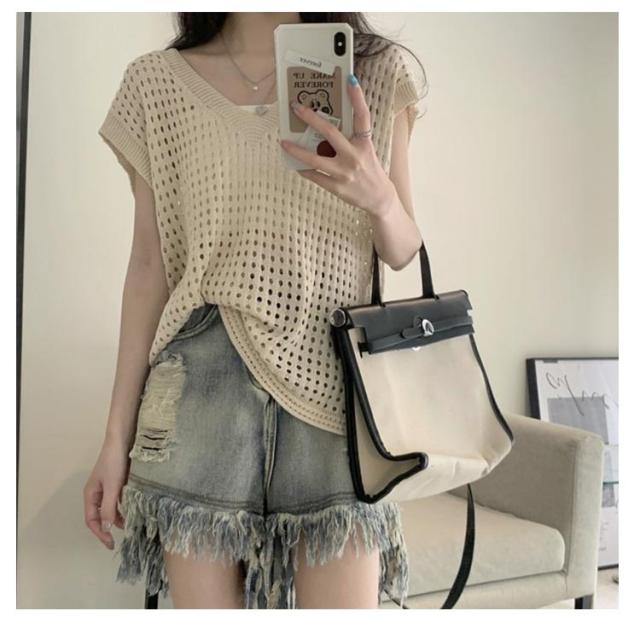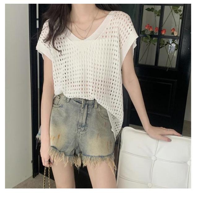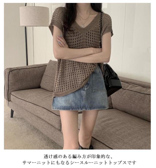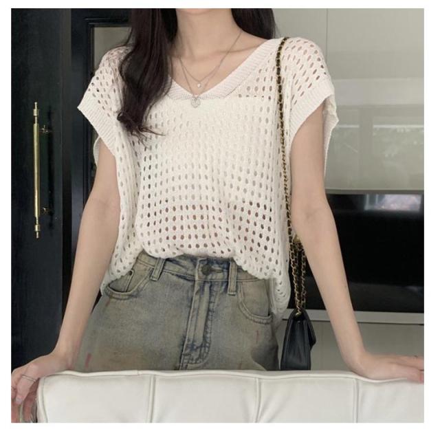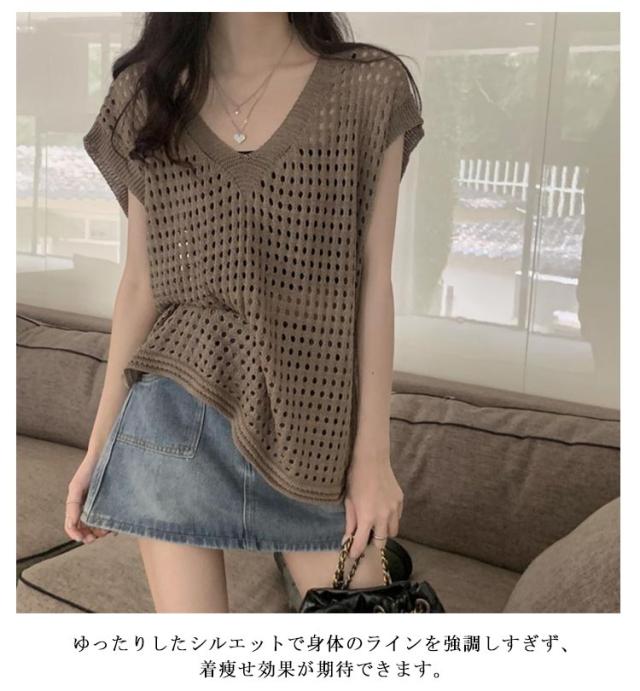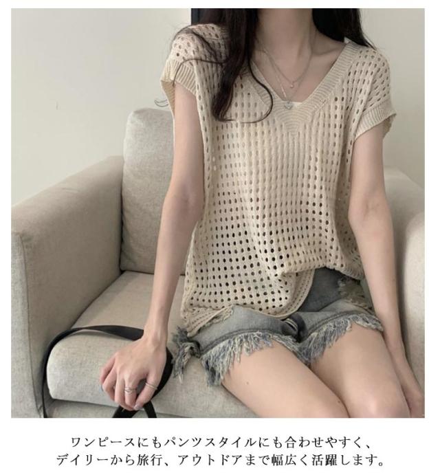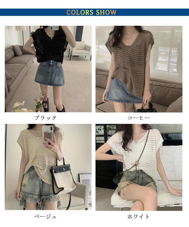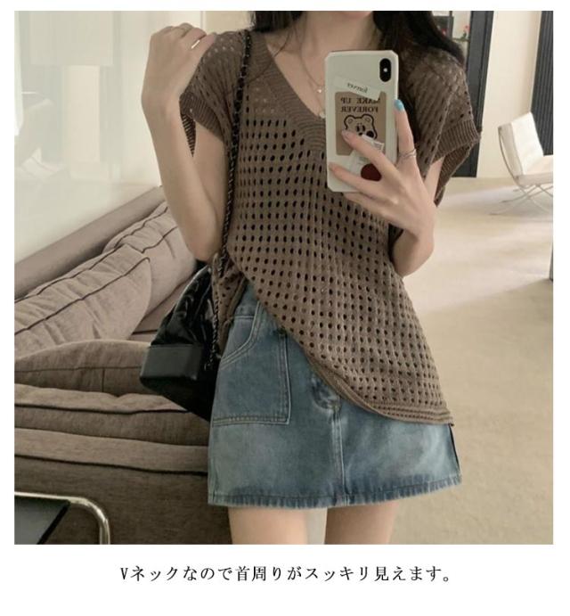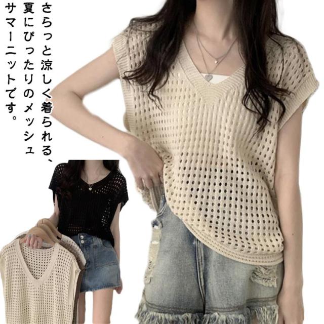 半袖 透け感 サマーニット メッシュニット 透かし編み セーター Vネック 薄手 ベスト ゆったり サマーニット トップス フレンチスリーブ 通勤 重ね着 体型カバー 冷房対策 無地 デート 夏物