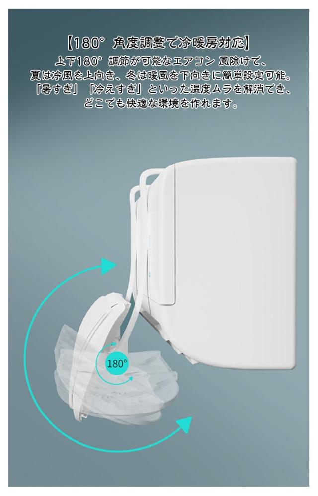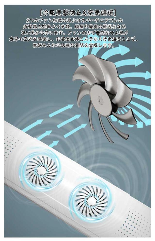 | 2つのファン搭載の風よけカバー。【伸縮75−103cm】 【冷風直撃防止&空気循環】2つのファン搭載の風よけカバーがエアコンの直撃風を効率よく分散。頭痛や鼻炎の原因となる強い風から守ります。ファンの力で自然なそよ風が素早く室内を循環し、お部屋全体にムラなく行き渡ることで、家族みんなの快適な空間を実現します。 【省電】エアコン 風よけの渦流循環設計で冷房効率30%向上!メーカー実測では、省エネ効果が確認されており、ご家庭の節電に役立ちます。 【結露防止・防カビ】2つのファン+複数通気孔を備えたエアコン風よけが冷気流を分散し、結露の発生を99%以上抑制。カビ繁殖を防ぎ、清潔な空気を維持します。 【180°角度調整で冷暖房対応】上下180°調節が可能なエアコン 風除けで、夏は冷風を上向き、冬は暖風を下向きに簡単設定可能。「暑すぎ」「冷えすぎ」といった温度ムラを解消でき、どこでも快適な環境を作れます。 【伸縮式で多機種対応】風除けカバーは75cmから103cmまで両側自由に伸縮可能で、99%の壁掛けエアコンに対応。賃貸住宅でも簡単に取り付けられ、直撃風問題を即解決します。 | |