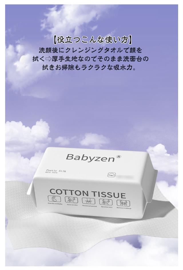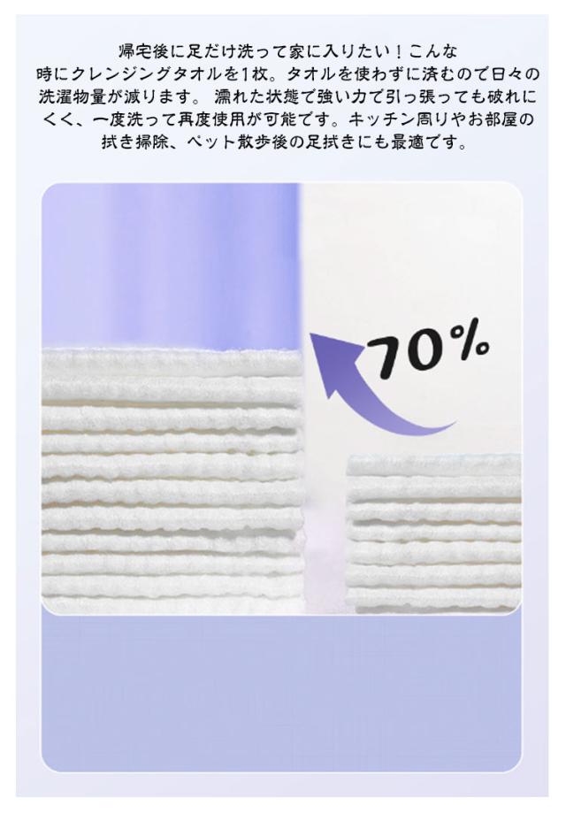 | 綿100%製使い捨てフェイスタオル。【エンボス加工】【100枚x4個セット】 【敏感肌に嬉しい100%天然コットン】クレンジングタオルはお肌に優しい100%天然コットン繊維を使用。大人の敏感肌にはもちろん、赤ちゃんにもお使い頂けます。【サイズ】約20cm×20cm 【内容量】100枚入×4個(計400枚) 【強靭で吸水力抜群】 エンボス加工により、肌触りを柔らかく、吸水性をアップさせました。 瞬時に程よい水分を吸水し、肌表面の水分を取り過ぎず乾燥しにくい。 普段お使いの化粧水や美容液を含ませてパックのように使用するのもおすすめです。 厚手の生地で適度な弾力感があり、汚れが落ちやすいです。 【多用途】 洗顔後のタオルの代わりに; いつものクレンジングを含ませてメイク落としに; スキンケア時のコットン代わりに; 吸水性を活かしてサッと拭き掃除に; もしもの時に必要な衛生用品としてなど、 水の多い環境にも活躍できます。 【地球環境にやさしい】 衛生的に使うための使い捨てタイプですが 微生物の力では分解できないシリコンや化学物質を含まない為、環境負荷が極めて小さい製品です。 【役立つこんな使い方】洗顔後にクレンジングタオルで顔を拭く?厚手生地なのでそのまま洗面台の拭きお掃除もラクラクな吸水力。 帰宅後に足だけ洗って家に入りたい!こんな時にクレンジングタオルを1枚。タオルを使わずに済むので日々の洗濯物量が減ります。 濡れた状態で強い力で引っ張っても破れにくく、一度洗って再度使用が可能です。キッチン周りやお部屋の拭き掃除、ペット散歩後の足拭きにも最適です。 | |