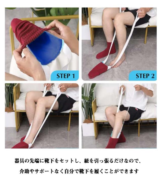 | 椅子に座ったまま簡単に靴下が履けるソックスエイド。 腰を曲げて前かがみになることなく椅子などに座ったまま楽な姿勢で靴下がはけます。 器具の先端に靴下をセットし、紐を引っ張るだけなので、介助やサポートなく自分で靴下を履くことができます 先端部が3つに分かれている先割れタイプですので、靴下へ抜き差しが簡単です。 内側はすべりの良い布、外側はすべりにくい布で覆われ、足の出し入れがスムーズです。 膝や腰を痛めてしまった方、かがむのが大変なご高齢の方や妊婦さん、車椅子を利用する方...など家族みんなで使える! | |