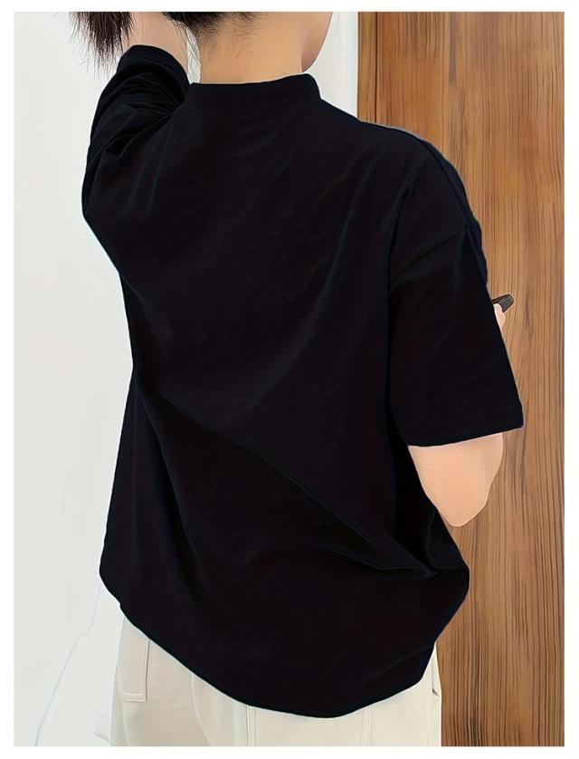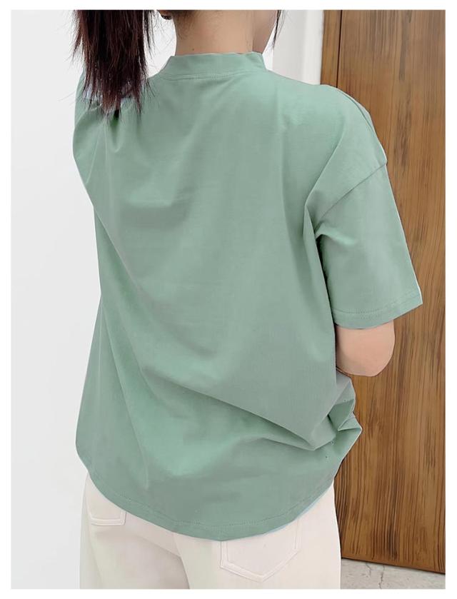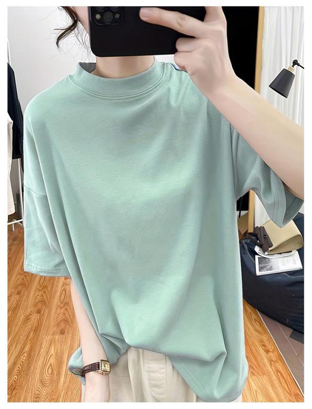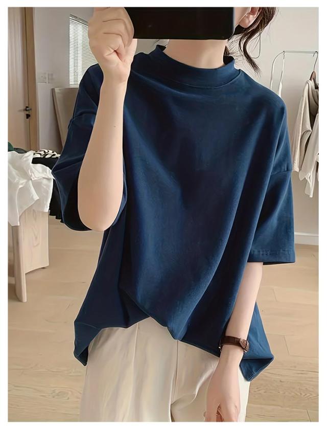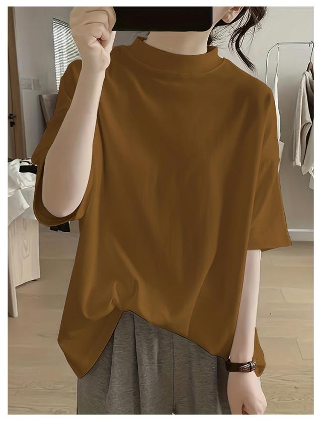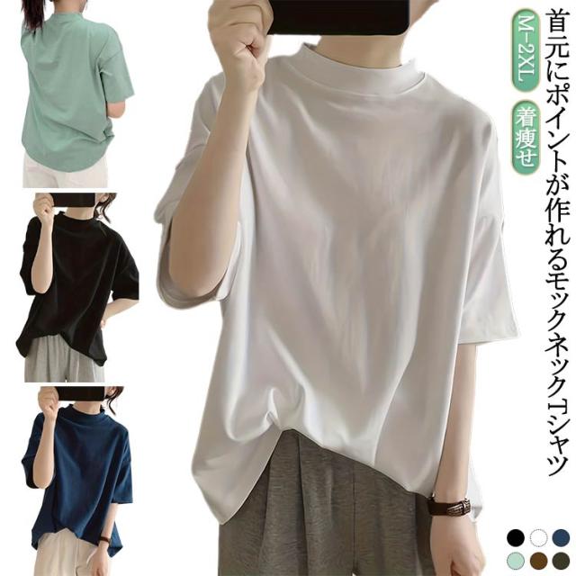 プチハイネック カットソー レディース トップス 綿 無地 コットン Tシャツ 体型カバー カットソー 5分袖 カットソー ドロップショルダー 大きいサイズ 夏 ゆったり 着?せ プチハイネック モックネック 半袖 シンプル 通勤 薄手 大人