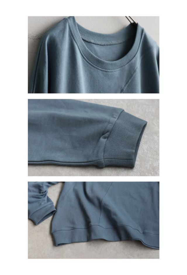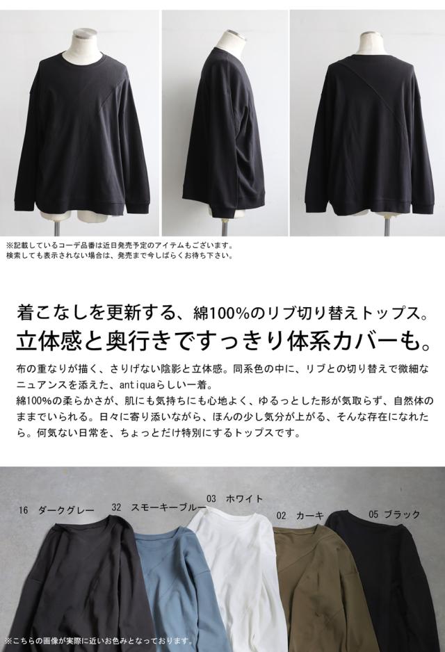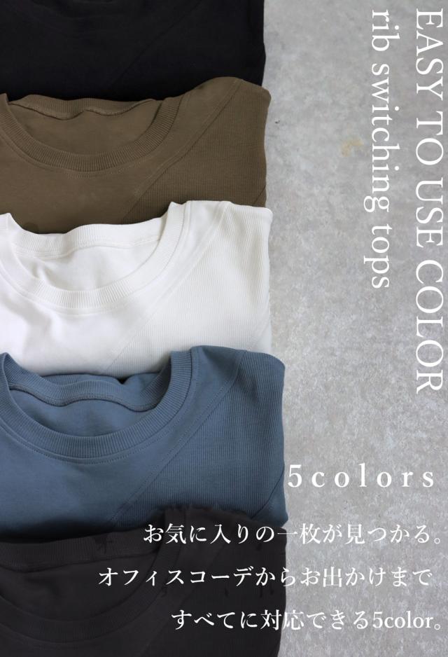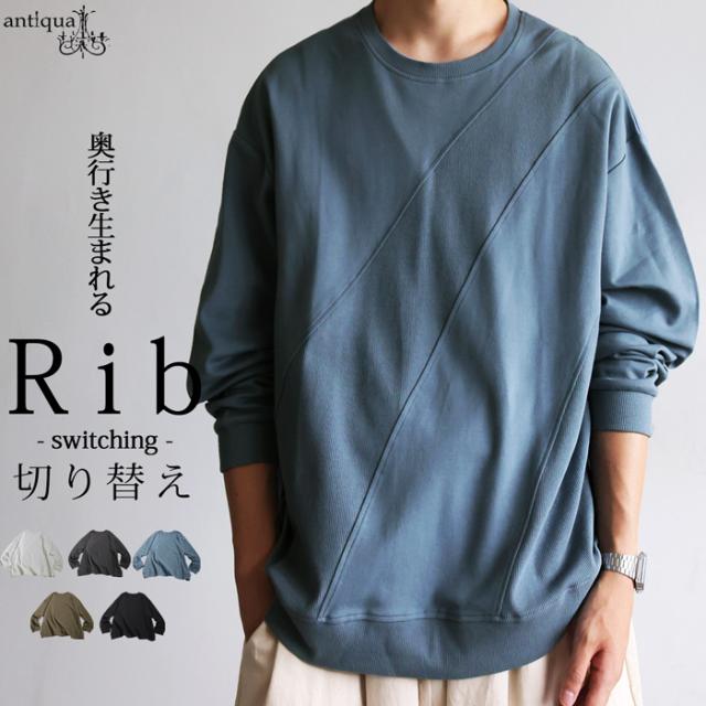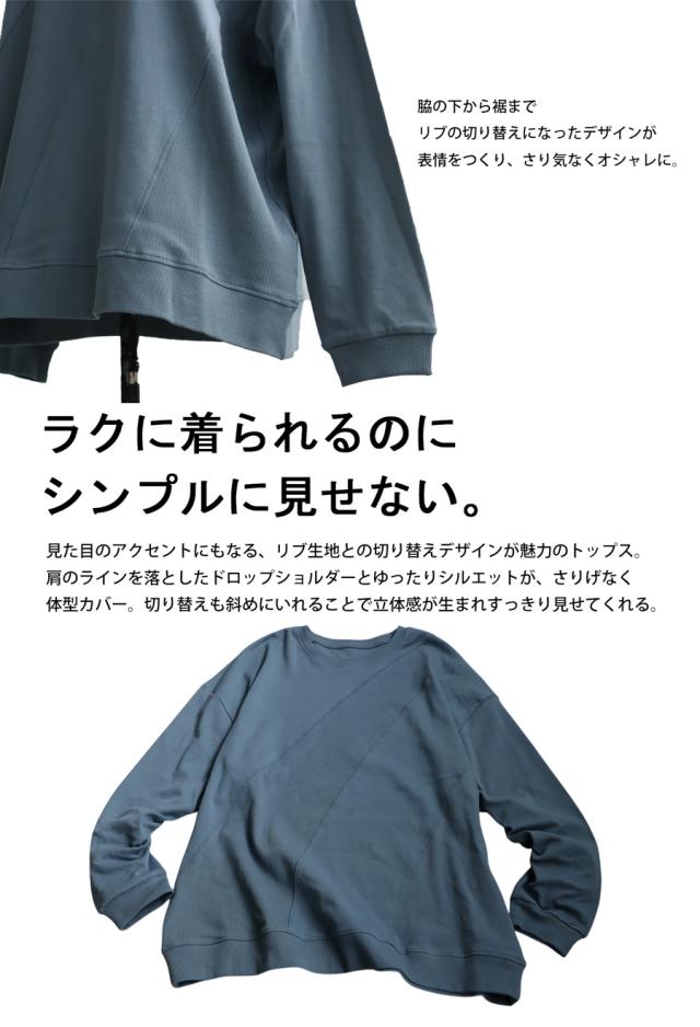異素材リブの切替がアクセントになった、綿100%(コットン)のクルーネック(丸首)トップスです。