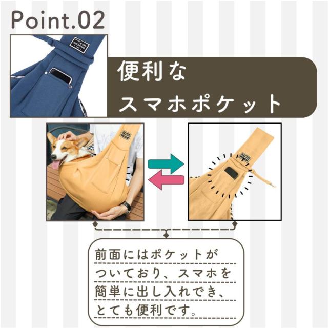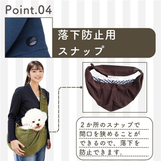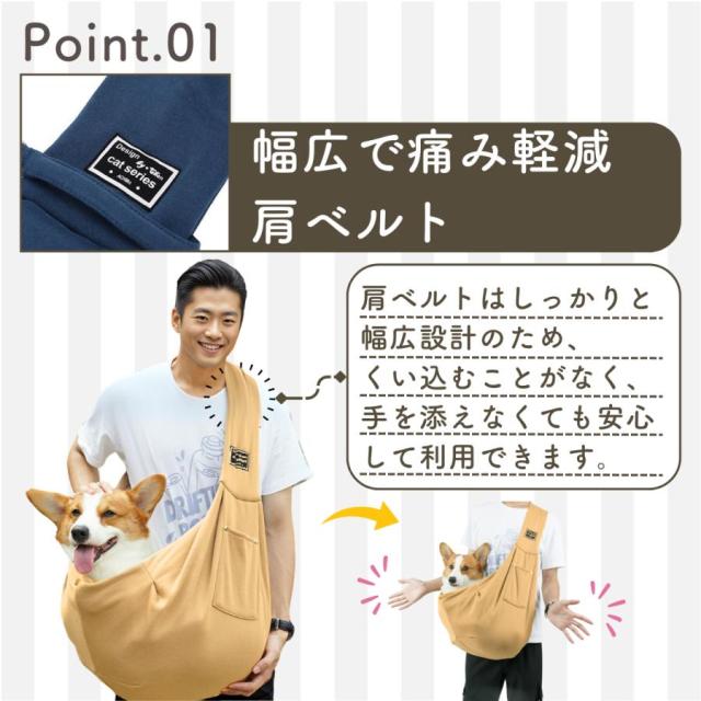 抱っこバッグではなく、肩から掛けるスリングタイプなので、ペットちゃんとの距離感もぐっと近くなります。 さらに、ペットちゃんも安心して過ごせる独自のデザインで、手軽に一緒にお出かけすることができます。