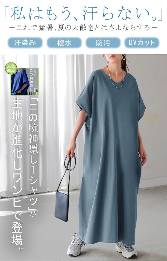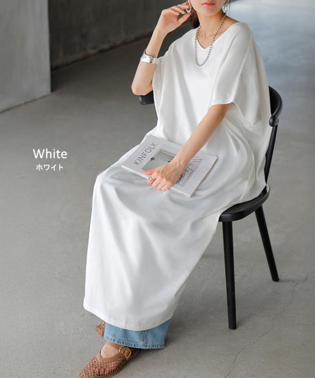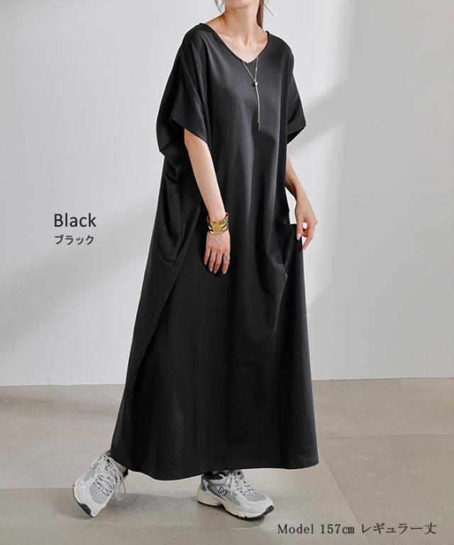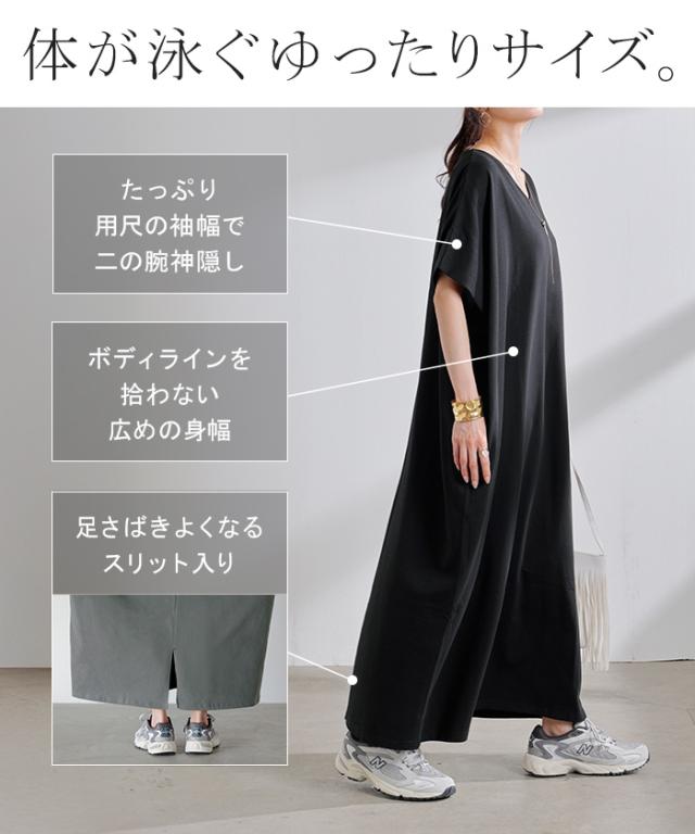 ワンピース ロング 半袖 汗ジミ 軽減 UVカット ワンピ 選べる ネック レディース 綿100% ロングワンピース Aライン Uネック Vネック マキシ マキシワンピース ワンピ ロングワンピ 体型カバー 二の腕カバー 大きいサイズ 無地 黒 白 春 夏 HUG.U 秋新作