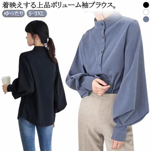 白シャツ トップス バルーン袖 薄手 レディース ボリューム袖 大きいサイズ 立ち襟 長袖 ボリューム袖 ゆったり 無地 ブラウス スタンドカラー カジュアル ハイネック 白ブラウス 通勤 ビジネス オフィス 事務服 フェミニン おしゃれ ブラウス きれいめ 送料無料 白 黒