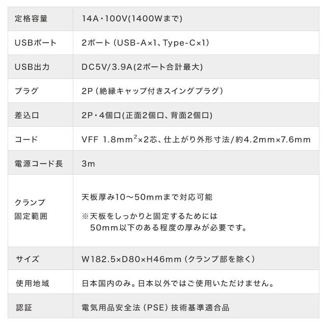 ⇒ご購入の前にご確認下さい机にガッチリ固定でき、ケーブルの抜き差しも可能。Type-CとUSB Aポートを搭載しスマホ・タブレットの充電にも対応。一括集中スイッチ搭載で、まとめて電源オン・オフが可能。ケーブル長が長めの3mで、昇降デスクなどにもオススメ。【WEB限定商品】