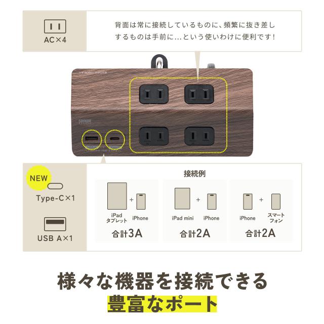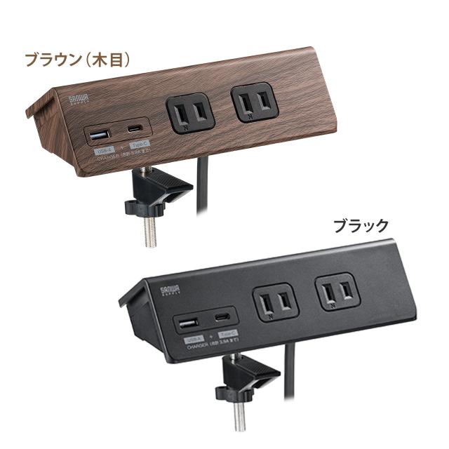 電源タップ USB充電 AC4個口 USB-C搭載 USB-A搭載 一括集中スイッチ 3m クランプ固定 ブラック ブラウン[700-TAP047UC-3]