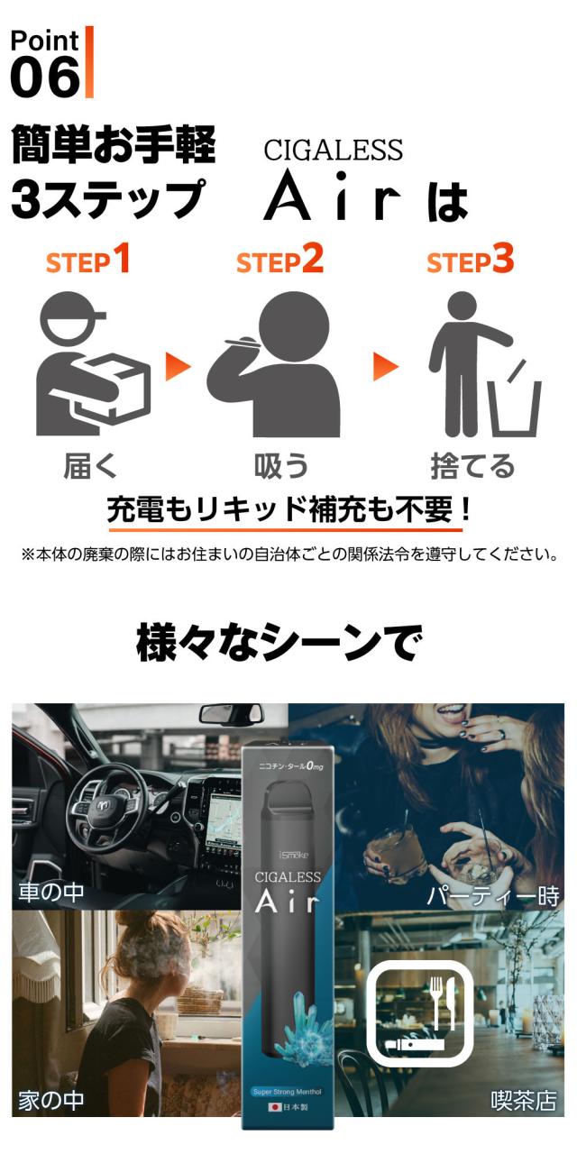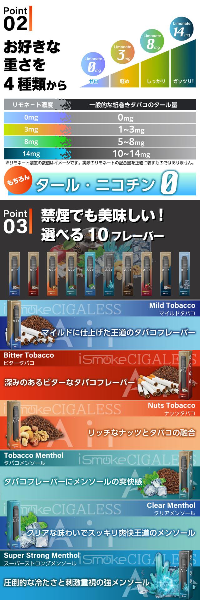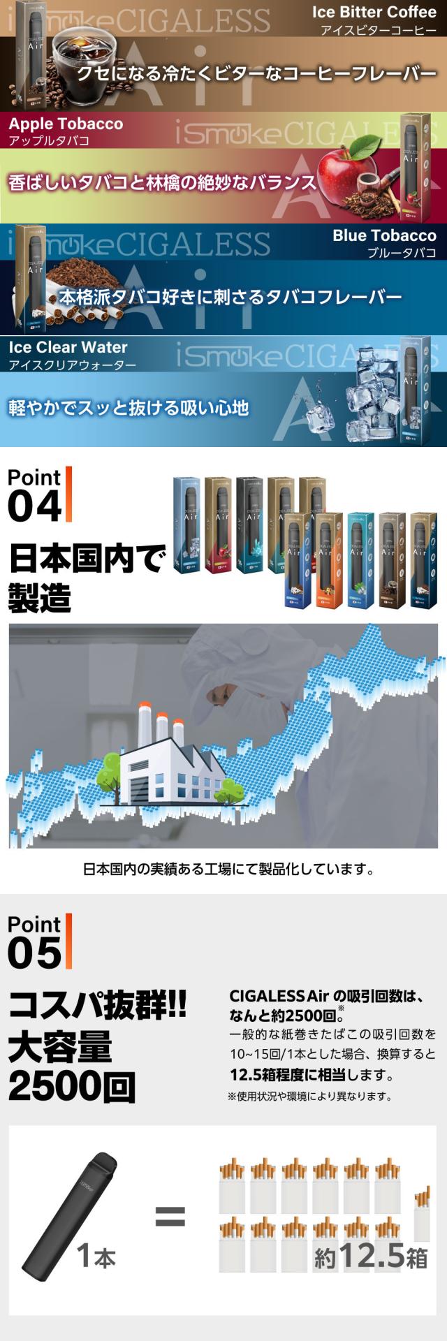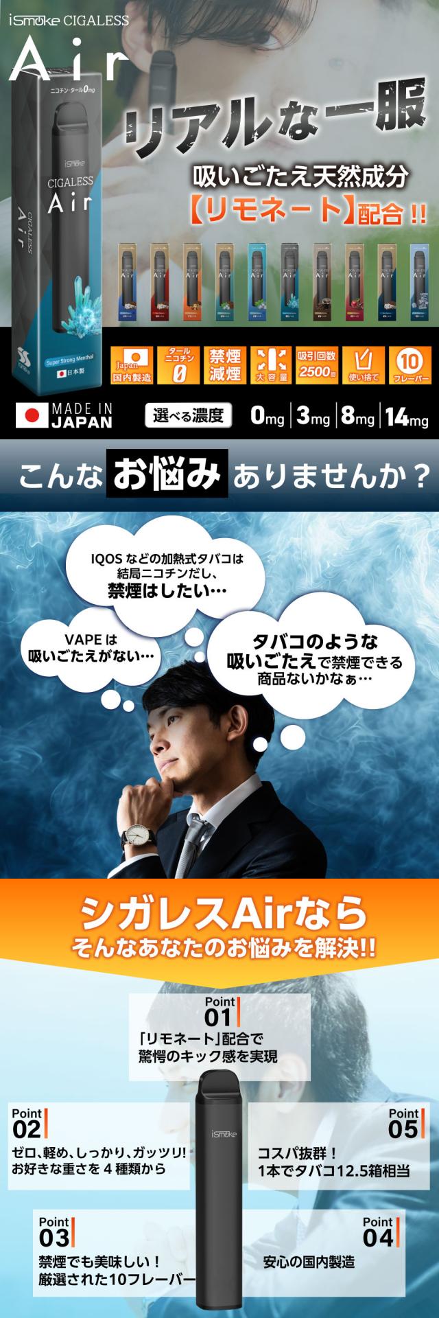今までにないリアルな吸いごたえ(キック感)を感じられる、使い捨て電子タバコの大容量タイプ「iSmoke CIGALESS Air(アイスモーク シガレス エアー)」が新登場!