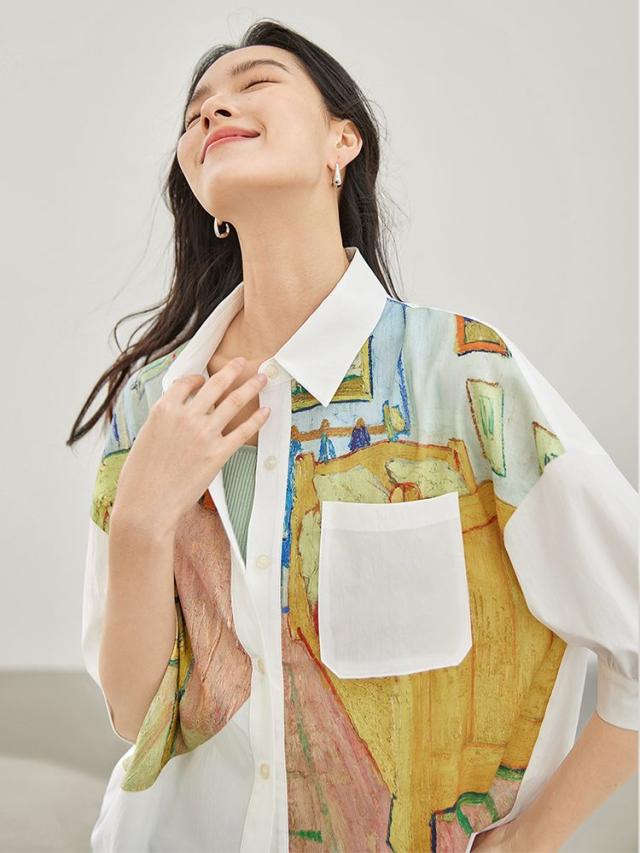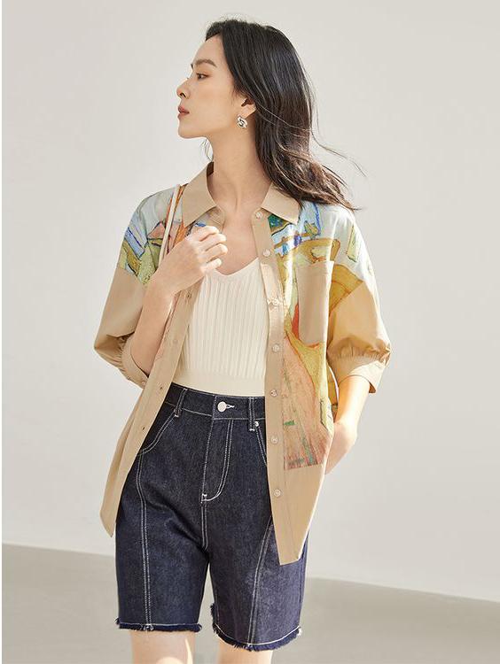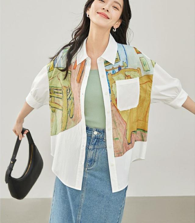 シャツ レディース 五分袖 前開き 総柄 ブラウス トップス 半袖 襟付き ゆったり 春 夏 秋 通勤 アートスタイル おしゃれ 上品 着回し