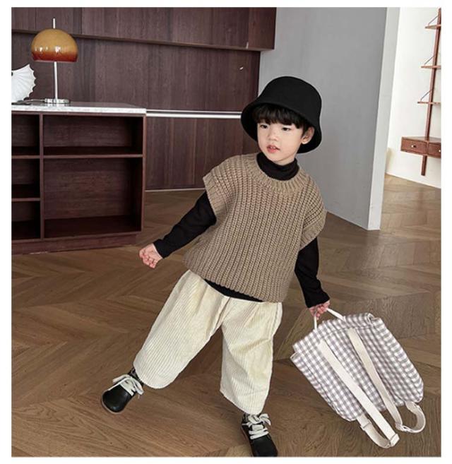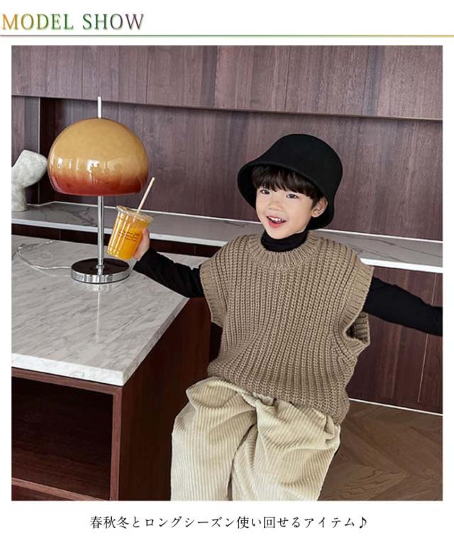 | ケープル編みのお洒落なKIDSニットベストです。 春秋冬とロングシーズン使い回せるアイテム♪ 軽く暖かいので、ストレスなく動きやすいのでお子様も快適♪ 室内着としてもお出かけ着としても着用していただける♪ Tシャツと組み合わせてもお洒落なアイテム♪ | |