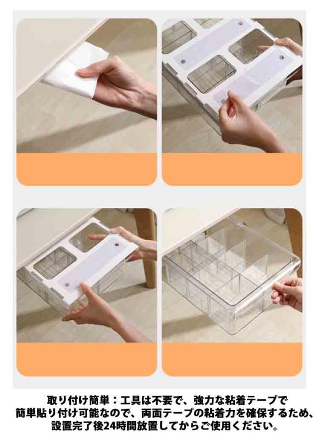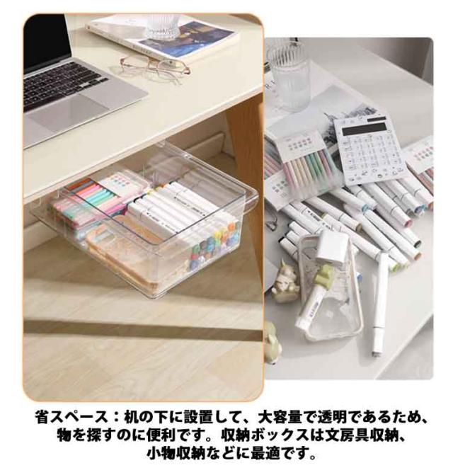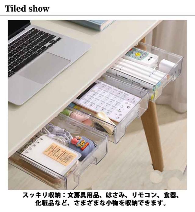 | 【机下・引き出し】【2個セット】【収納増設】 スッキリ収納:文房具用品、はさみ、リモコン、食器、化粧品など、さまざまな小物を収納できます。 デスクトップをきれいに清潔な状態に保ちながら、文房具や小物を手の届くところに保管できます。 省スペース:机の下に設置して、大容量で透明であるため、物を探すのに便利です。収納ボックスは文房具収納、小物収納などに最適です。 取り付け簡単:工具は不要で、強力な粘着テープで簡単貼り付け可能なので、両面テープの粘着力を確保するため、設置完了後24時間放置してからご使用ください。 適用場所:デスク下のみならず台所・洗面などにもお使いして頂けます。卓下式引き出しは、デスクや本棚の下、クローゼットの隙間など場所取らず自由に設置でき、スペースの有効活用に繋がります。パソコンデスク、オフィス、書斎、お手洗い、台所、浴室などに適用可能です。 | |