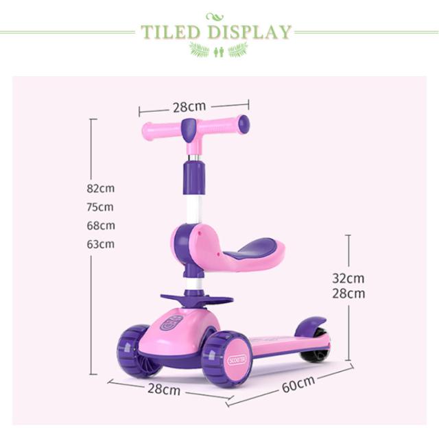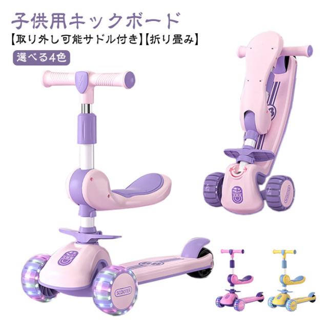 | 【子供用キックボード】【取り外し可能サドル付き】【折り畳み】【選べる4色】 幅広い光るタイヤが特徴の折りたたみ式三輪キックボード。 大きめのタイヤを採用することで安定性を高めたキックボードで倒れ防止し、各種道路に適用。 高さ調整も82/75/68/63cmと四段階調整が可能で、お子様の成長に合わせて調整が可能です。 方向転換はハンドルを左右に傾けると、タイヤが自動的に方向を変え、ブレーキにはフットブレーキを採用。 使用しないときはコンパクトに折りたたむことが可能。 折りたたみ方法: ハンドルを上に引き出して、踏み台に折りたたみました。 (ご注意:公道での走行は大変危険ですので絶対におやめください。) | |