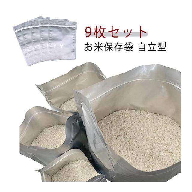 | 9枚セット お米保存袋 自立型 鮮度を保つ三層構造(外層PET、中層アルミニウム、内層ポリエチレン) マチ付きでしっかり自立 お米以外にも!ペットのおやつ保管にも! | |