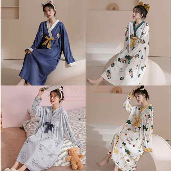 春夏秋部屋着長袖ワンピースレディースパジャマ部屋着全4色