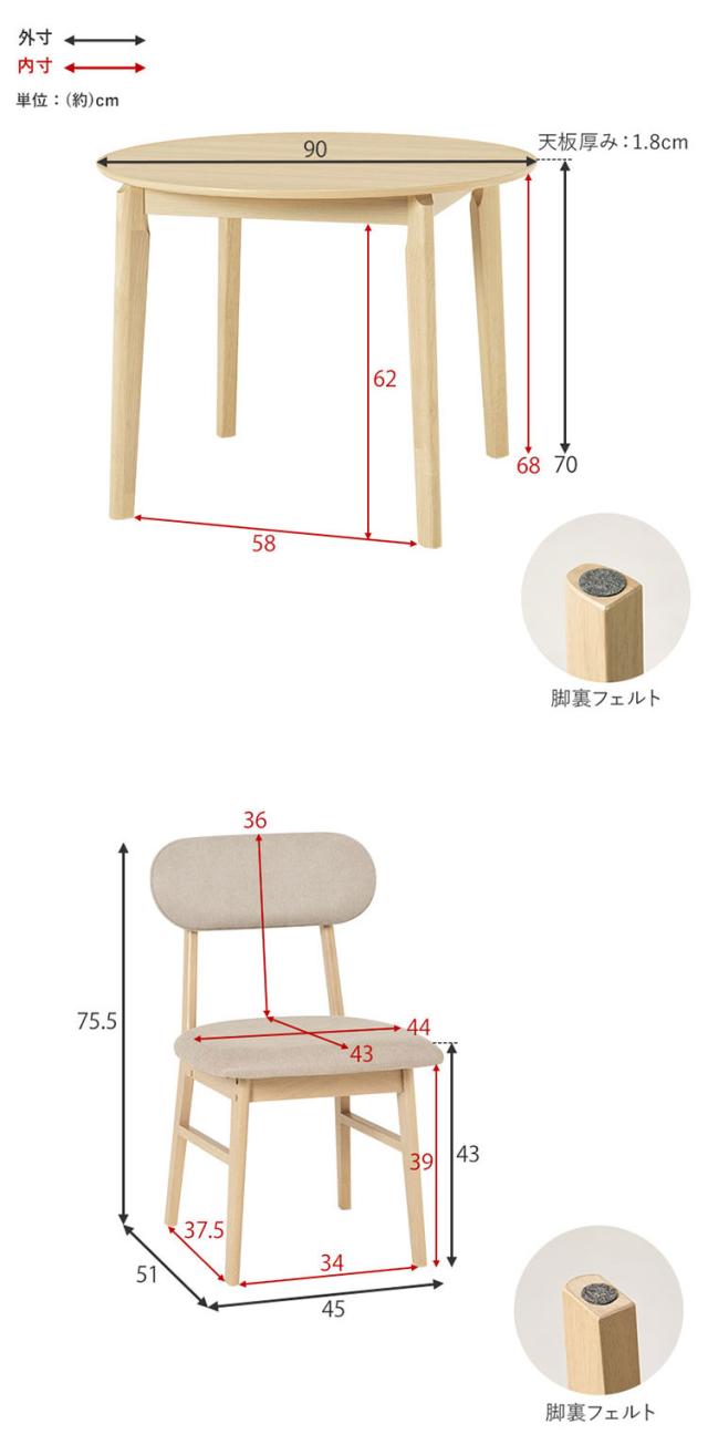 テーブル:(約)幅90×奥行90×高さ70cm、チェア:(約)幅45×奥行51×高さ75.5×座面高43cm