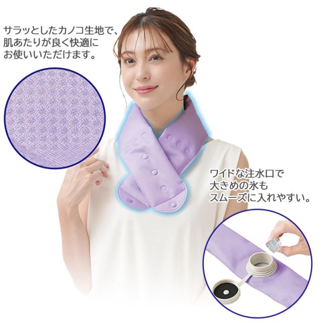 | 使用上のご注意 | ●本品は医療機器ではございません。●本品着用時に息苦しいなどの違和感を覚えた場合はすぐにご使用をおやめください。●就寝時のご使用はおやめください。●ネックレスなどの装飾品を付けたまま使用しないでください。●お子様がご使用になる場合、保護者の方が必ず付き添ってください。●体感温度は、体温・外気温度により異なります。●使用感には個人差があります。●お肌に合わない場合や、かぶれ・かゆみ等を感じた場合はご使用をおやめください。●傷・かぶれ・湿疹等のある場合はご使用しないでください。●ご使用中、またはご使用後に異常を感じた場合はすぐにご使用をおやめください。●本品は水・氷専用ですので、お湯や熱湯は入れないでください。ドライアイスのご使用もおやめください。●水もれが発生しますので、キャップが完全にしまっている事をご確認後、ご使用ください。●結露(生地が濡れたような状態)が生じた場合はタオル等で包んでご使用ください。●破損の原因になるので、投げる・落とす・先のとがった物で突く・切る・歯でかむ・ねじる・強い力で踏む・重い物をのせるなどの衝撃は与えないでください。●本品でご使用した水・氷は飲まないでください。●破れる原因となりますので、周囲に凹凸のあるものや尖ったものなどがないことを確認してから使用してください。●洗濯機の手洗いコースでの洗濯はお避けください。●ご使用後は必ず水・氷を捨てて、ぬるま湯または水ですすぎ洗いし、陰干しして、よく乾燥させてから保管してください。(洗濯機・乾燥機不可)●濡れたまま保管するとカビが発生することがありますので十分に乾かしてから保管してください。●火気のそばや高温多湿な場所、直射日光の当たる場所には保管しないでください。●乳幼児の手の届かない場所に保管してください。●廃棄するときは各自治体の処分方法に従ってください。●本来の目的以外でのご使用はおやめください。●本品の仕様やデザインは予告なく変更する場合があります。●印刷の都合上、実際の商品と多少色が異なる場合があります。 |