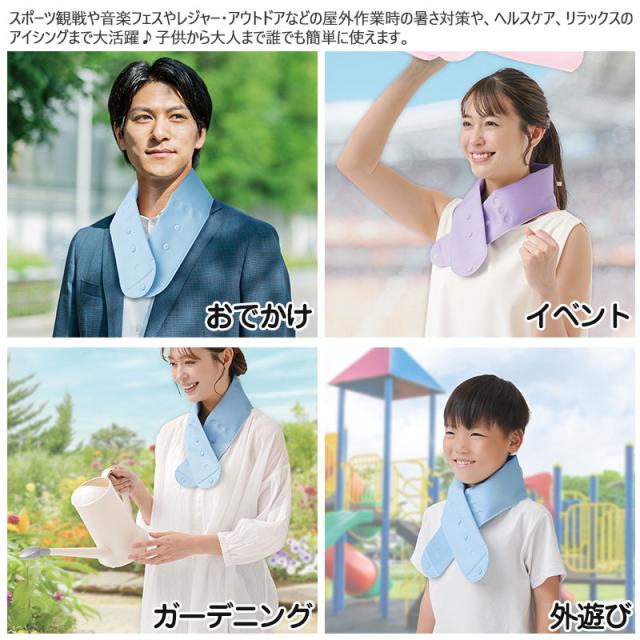 | ご使用方法 | 【1】キャップを開き、氷や冷水を本品の約2/3程度まで入れて、中の空気を抜きながら、キャップをしっかり閉じてください。 ※入れすぎると水があふれるおそれがあります。流し台やお風呂場など、水がこぼれても良い場所で行ってください。 ※必ず注水口を持ってしっかり閉じてください。生地を持って閉めると生地が破れるおそれがあります。 【2】キャップが首の後ろにくるように巻き、首のサイズに合わせて両端に3つずつある、スナップボタンでとめてください。 ※冷えすぎと感じる場合はタオル等で包んでご使用ください。 |