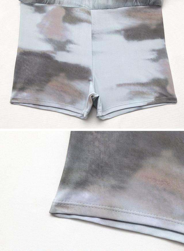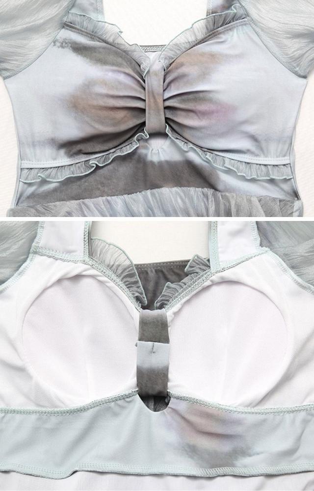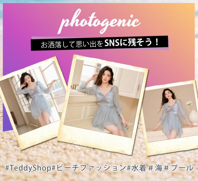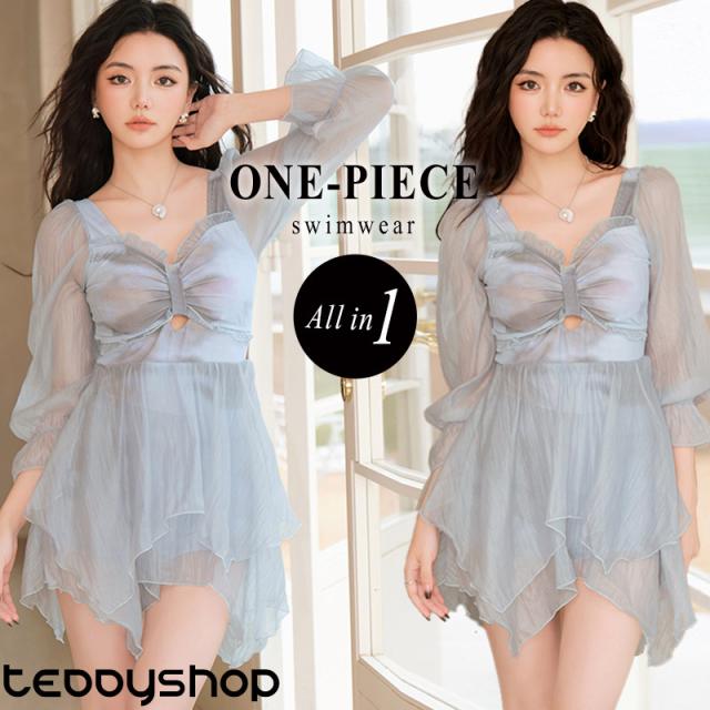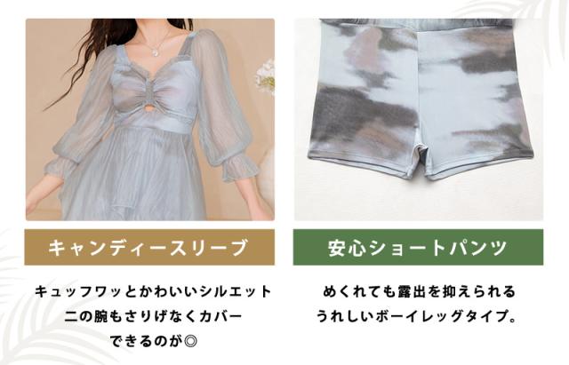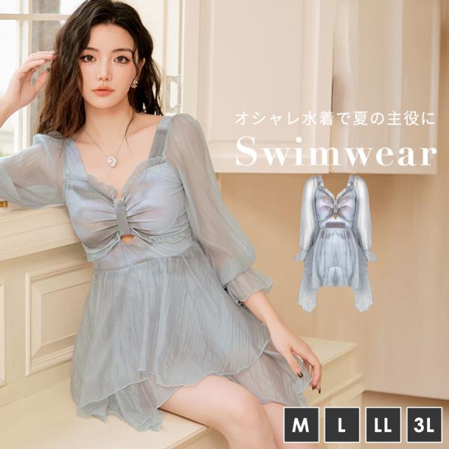 夏新作 水着 ワンピース 体型カバー レディース オールインワン 7分袖 キャンディスリーブ リボン風デザイン ノンワイヤー モールドカップ ティアードスカート ラメ風 シボ加工 オーガンジー 二の腕 ウエスト ヒップ 太もも カバーアップ シンプル