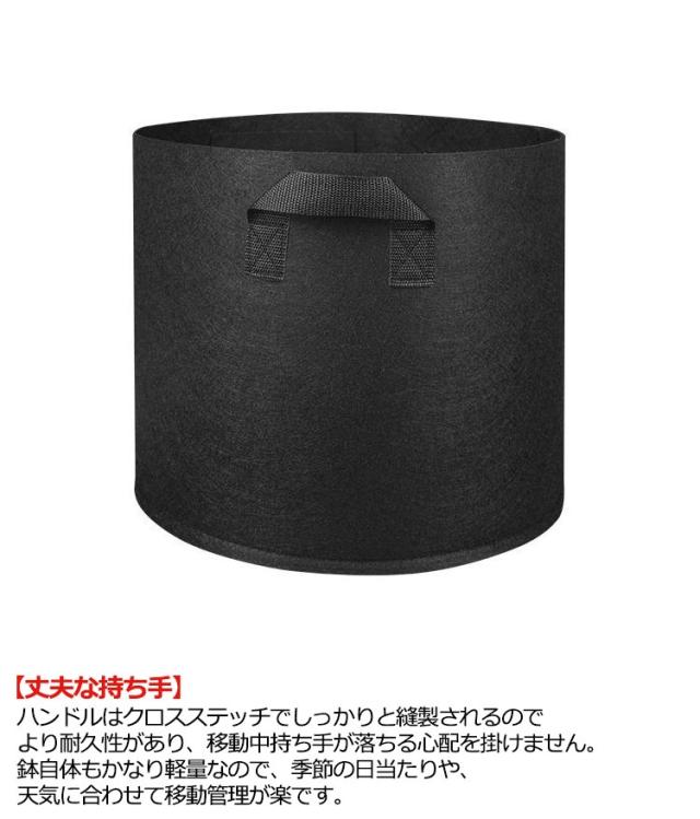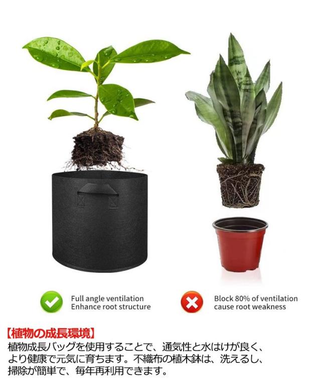 | 10個不織布プランター。 頑丈な持ち手2ヶ所で持ち運びもらくらく! 【通気性・透水性】厚手の不織布で作られて、通気性、透水性に優れているので植物の発育に適しています。無公害、環境にやさしく、再利用可能の植え袋です。 【丈夫な持ち手】ハンドルはクロスステッチでしっかりと縫製されるのでより耐久性があり、移動中持ち手が落ちる心配を掛けません。鉢自体もかなり軽量なので、季節の日当たりや、天気に合わせて移動管理が楽です。 【植物の成長環境】植物成長バッグを使用することで、通気性と水はけが良く、より健康で元気に育ちます。不織布の植木鉢は、洗えるし、掃除が簡単で、毎年再利用できます。 【適用シーン】庭の花、野菜の植え付け(ジャガイモ、トマト、コショウ、ほとんどの緑の野菜)、苗の移植、屋内と屋外の植物の装飾、家の植え付け、温室の植え付け。 | |