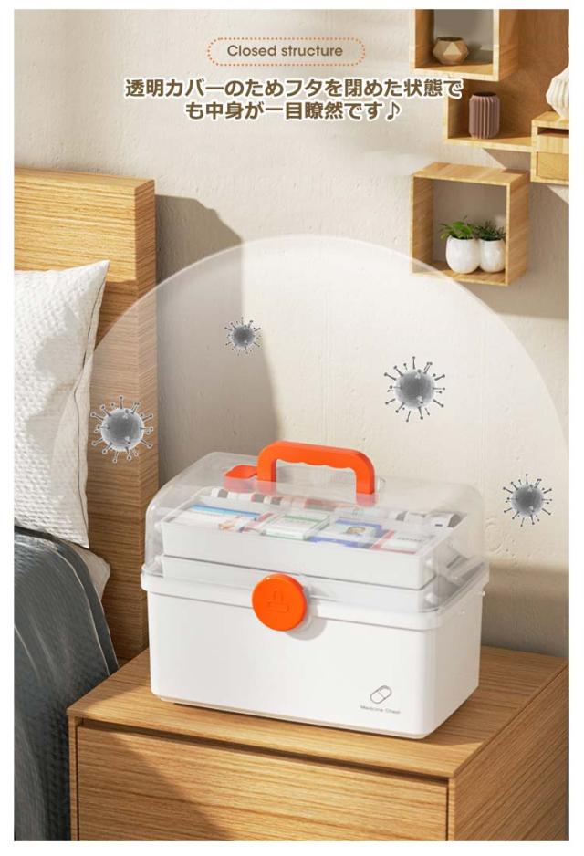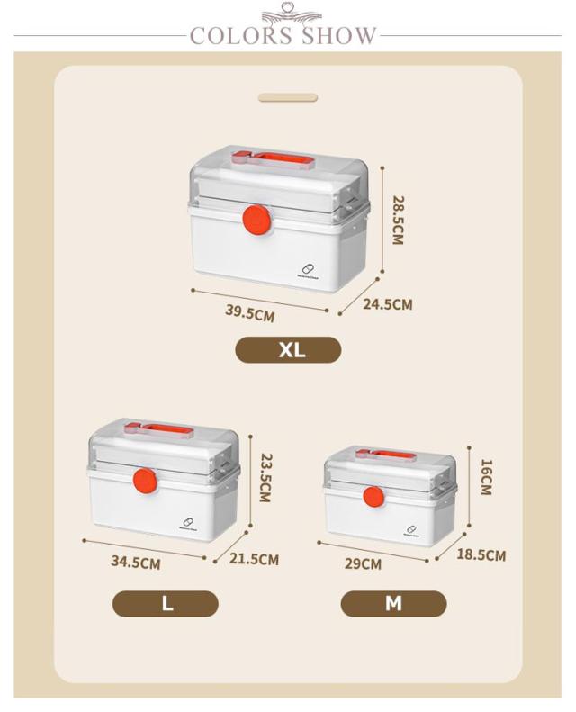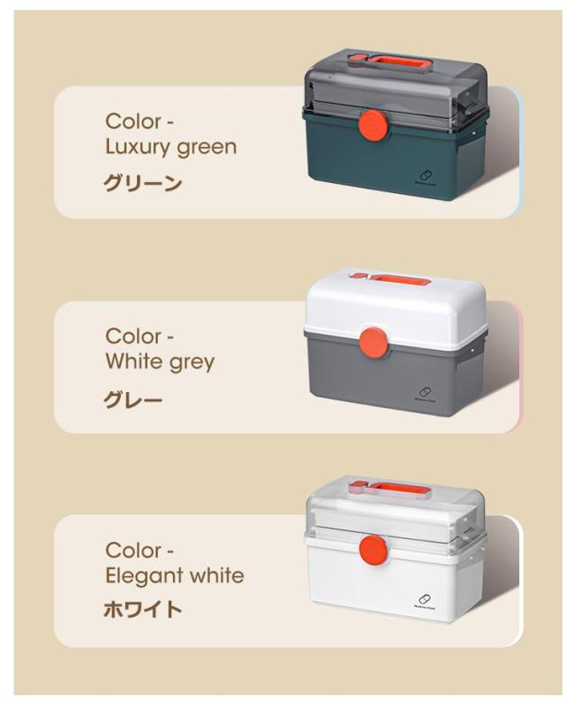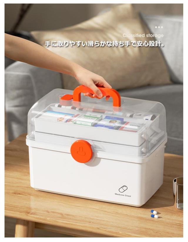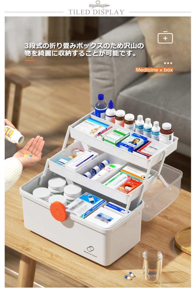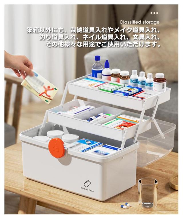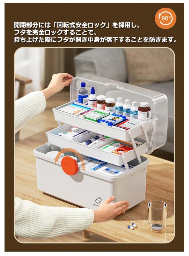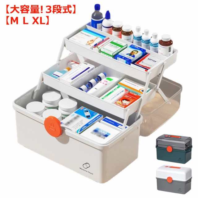 | 【大容量! 3段式】 【M L XL】 3段式の折り畳みボックスのため沢山の物を綺麗に収納することが可能です。 開閉部分には「回転式安全ロック」を採用し、フタを完全ロックすることで、持ち上げた際にフタが開き中身が落下することを防ぎます。 手に取りやすい滑らかな持ち手で安心設計。 透明カバーのためフタを閉めた状態でも中身が一目瞭然です♪ 薬箱以外にも、裁縫道具入れやメイク道具入れ、釣り道具入れ、ネイル道具入れ、文具入れ、その他様々な用途でご使用いただけます。 | |