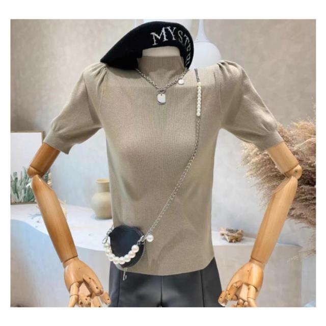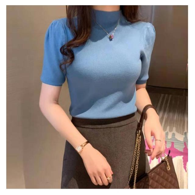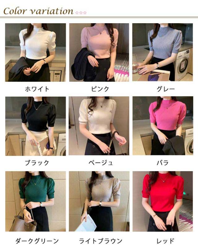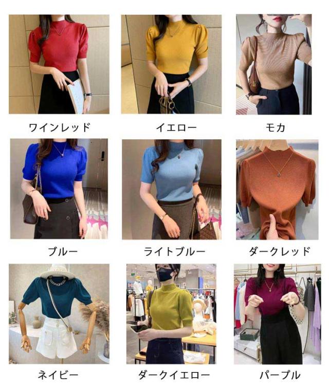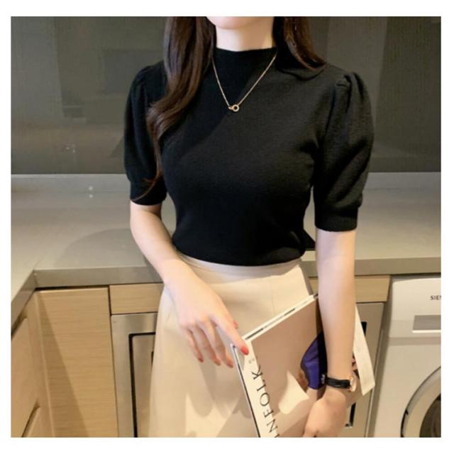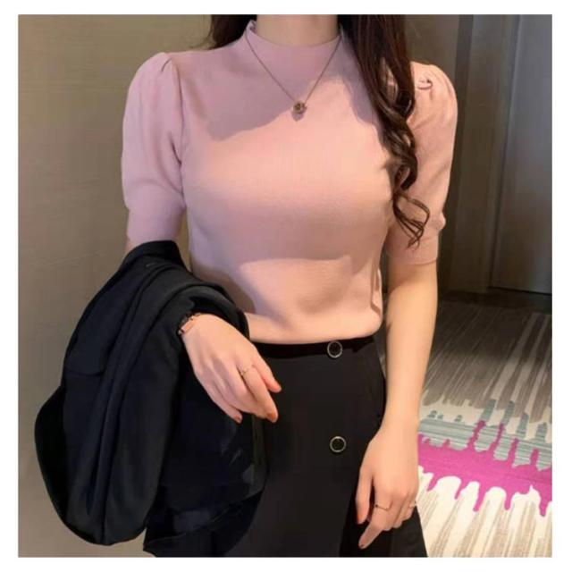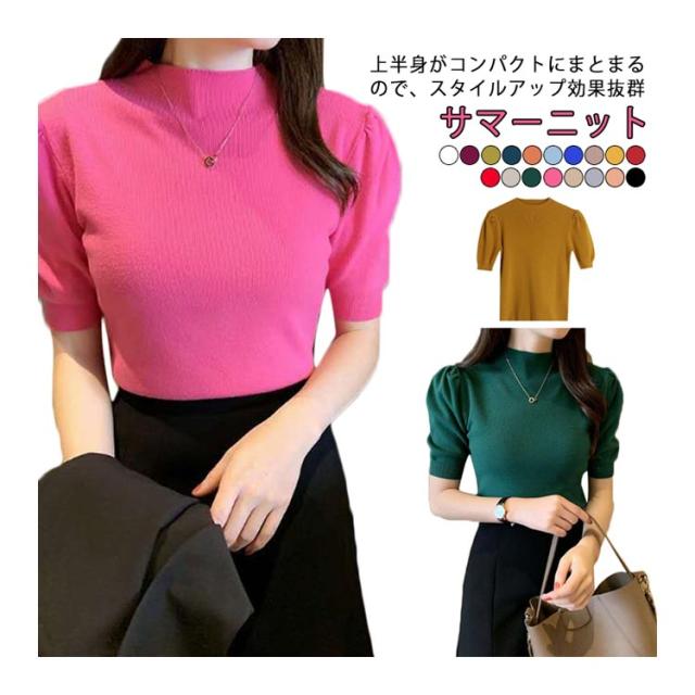 ハイネック サマーニット Tシャツ シンプル 半袖 レディース セーター トップス リブニット 5分袖ニット 半袖ニット タートル 上品 ニット オフィスカジュアル 無地 五分袖 きれいめ 春 可愛い 大人 ニット 夏 秋 韓国ファッション 20代 30代 40代