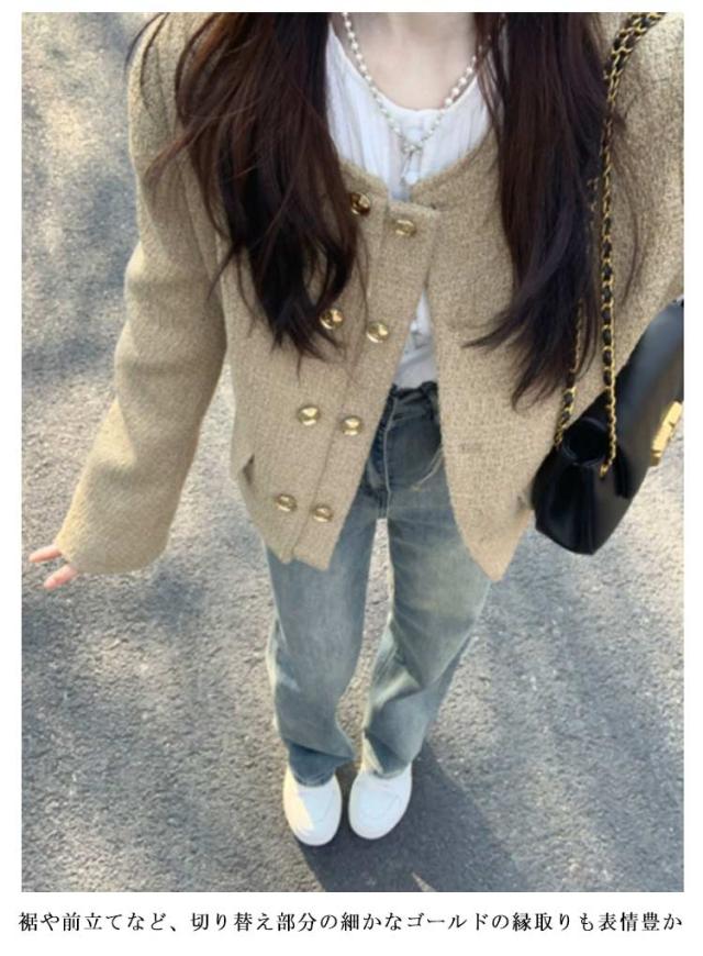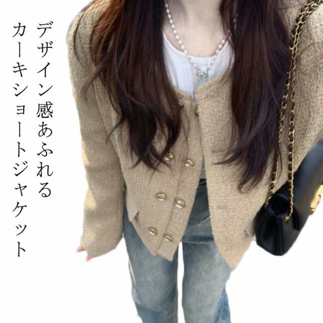| デザイン感あふれるカーキショートジャケット ダブルボタンがデザインのアクセント 羽織るだけできちんと感の出るジャケットはオフィスやセレモニーなど様々なシーンで活躍してくれること間違いなし 裾や前立てなど、切り替え部分の細かなゴールドの縁取りも表情豊か | |