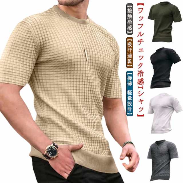 Tシャツ メンズ 半袖tシャツ 半袖 夏服 メンズ 冷感Tシャツ 接触冷感 トップス クルーネック 清涼感アップ ワッフルチェック 吸汗速乾 極薄 軽量 涼しい 快適 通気 夏 伸縮性 カットソー 大きいサイズ おしゃれ カジュアル かっこいい プレゼント 誕生日 送料無料 S-3XL