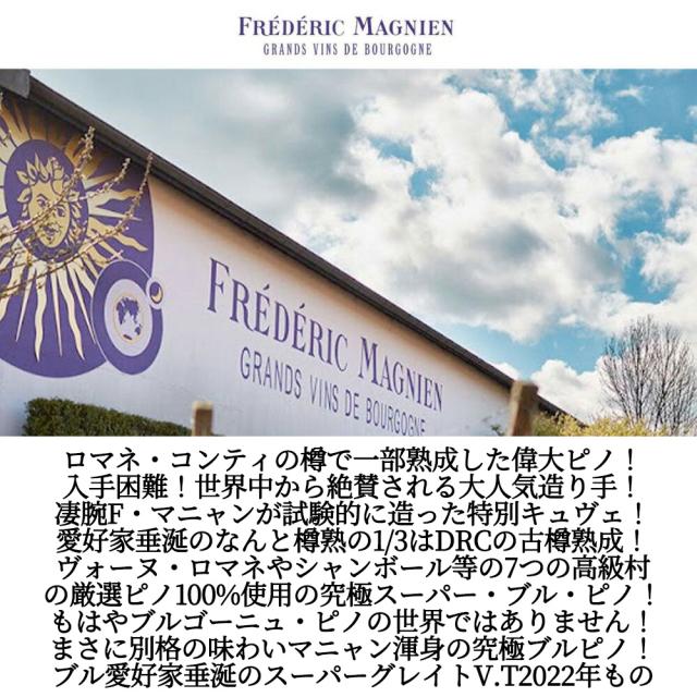 ロマネ・コンティの樽で一部熟成した偉大ピノ!入手困難!世界中から絶賛される大人気造り手!凄腕F・マニャンが試験的に造った特別キュヴェ!愛好家垂涎のなんと樽熟の1/3はDRCの古樽熟成!ヴォーヌ・ロマネやシャンボール等の7つの高級村の厳選ピノ100%使用の究極スーパー・ブル・ピノ!もはやブルゴーニュ・ピノの世界ではありません!まさに別格の味わいマニャン渾身の究極ブルピノ!ブル愛好家垂涎のスーパーグレイトV.T2022年もの