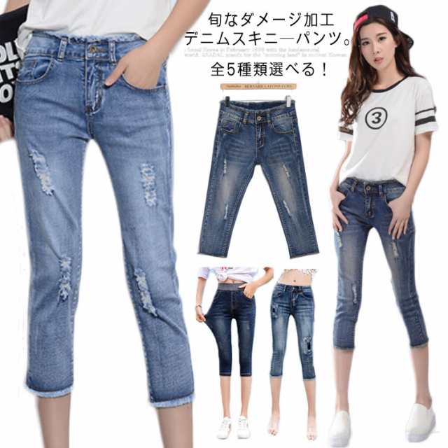すらっと細見え美ライン!スキニーデニム レディース スキニーパンツ デニムパンツ ジーンズ レギパン クロップドパンツ 7分丈 ボトムス フリンジ カットオフ ダメージ加工 美脚 ストレッチ 春夏
